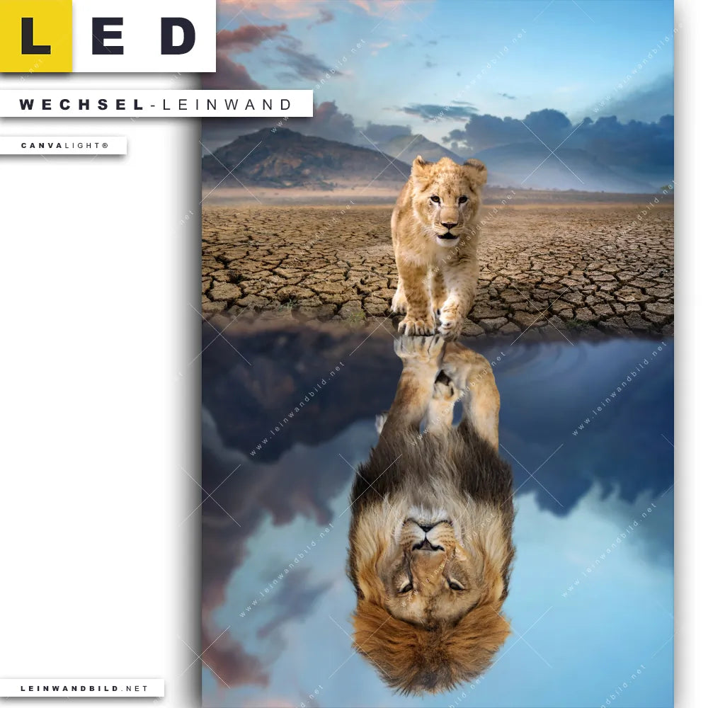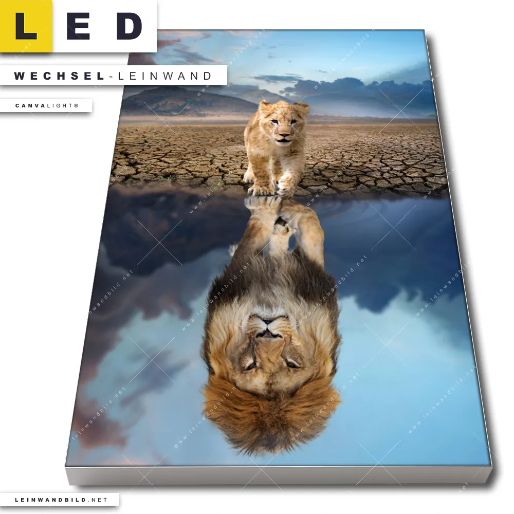 Du bist auf der Suche nach einer Tierwelt Wechsel-Leinwand für Dein LED-Leinwandbild im Hochformat? Begriffe wie Raubkatze, Löwe, Afrika, wild, Safari, Lion, Löwenjunges, Spiegelbild, Wasserspiegelung, Spiegelung, Löwenbaby haben Dich auf der Suche nach Deiner Ersatz-Leinwand für dein LED Wandbild mit wechselbarer Leinwand inspiriert? Farben wie Braun, Beige, Hellblau, Blau dürfen auf Deinem neuen Wechselmotiv für Dein XXL Leinwand-LED-Bild nicht fehlen und Leinwände im Modern Art Stil für Leuchtbilder passen perfekt zu Deinem Einrichtungsstil?