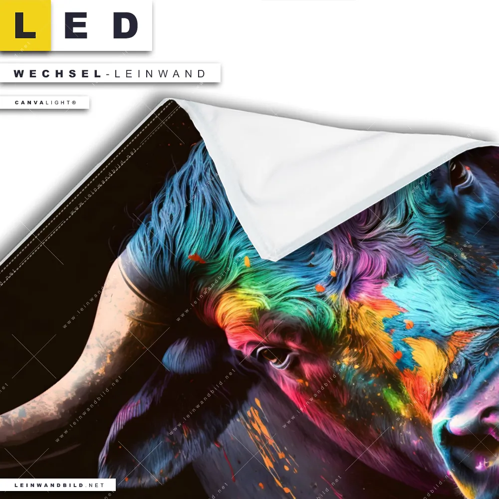 Dann sollte die Wechsel-Leinwand Canvalight® TEX | Stier mit bunten Farben | Quadrat den Weg zu Dir finden. Die Austausch-Leinwand Stier-Porträt mit Farbspritzern - passend für unsere stufenlos dimmbaren, steckerfertigen Leinwandbilder im Leuchtrahmen mit Fernbedienung und optionaler Farbtemperatursteuerung - fügt sich als Eye-Catcher harmonisch in jedes Bar - Gastronomie, Wohnzimmer - Schlafzimmer, Flur - Eingangsbereich, Büro - Kanzlei Raumkonzept ein.