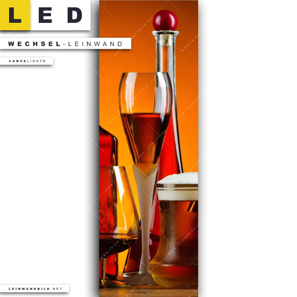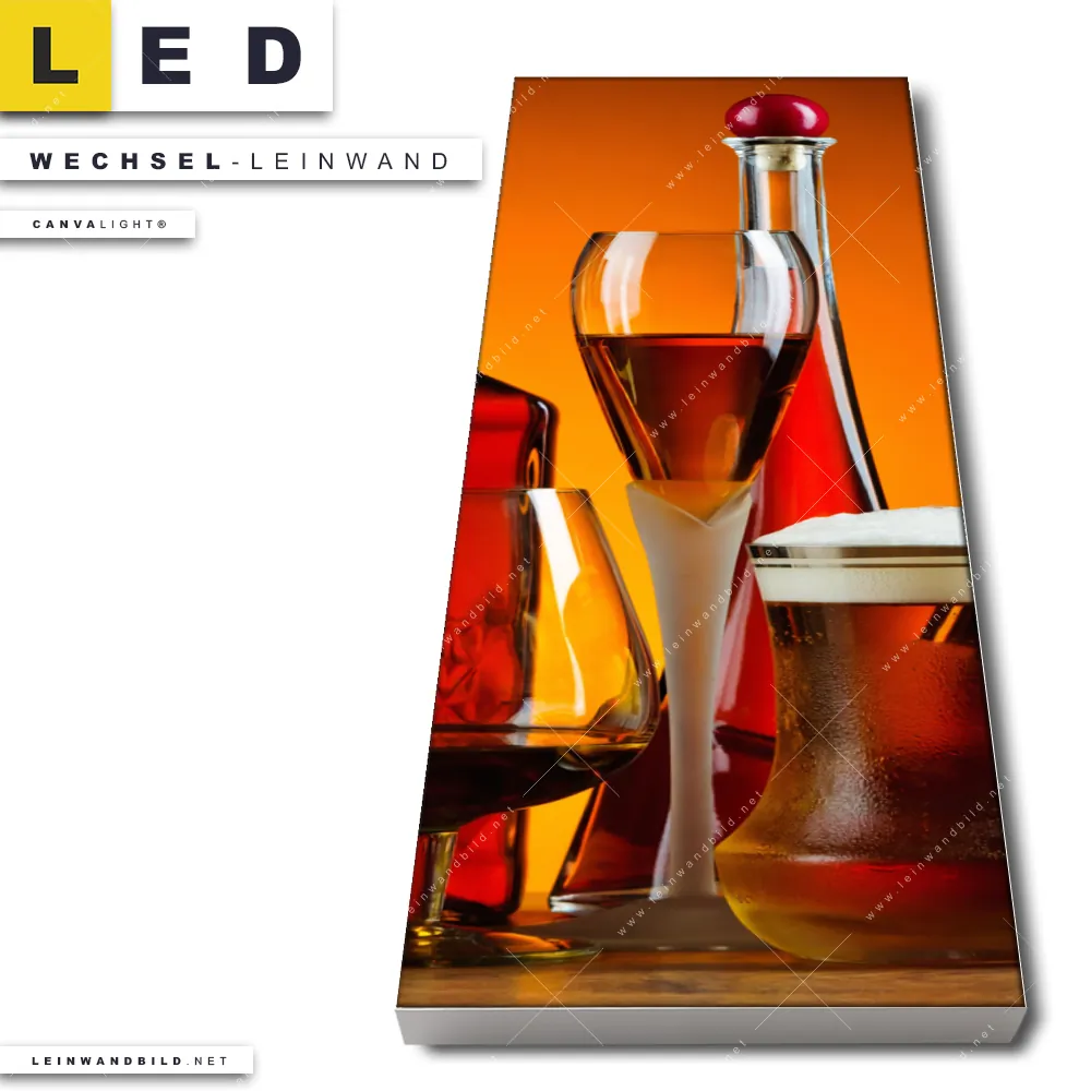 Du bist auf der Suche nach einer Essen - Trinken Wechsel-Leinwand für Dein LED-Leinwandbild im Schmalen Format? Begriffe wie Flaschen, Glas, Getränke, Wein, Whiskey, Bier, Cognac, Likör, Alkohol haben Dich auf der Suche nach Deiner Ersatz-Leinwand für dein LED Wandbild im Panorama-Hochformat mit wechselbarer Leinwand inspiriert? Farben wie Gold, Orange, Rot dürfen auf Deinem neuen Wechselmotiv für Dein XXL Leinwand-LED-Bild nicht fehlen und Leinwände im Natürlich - Realistisch Stil für Leuchtbilder passen perfekt zu Deinem Einrichtungsstil?