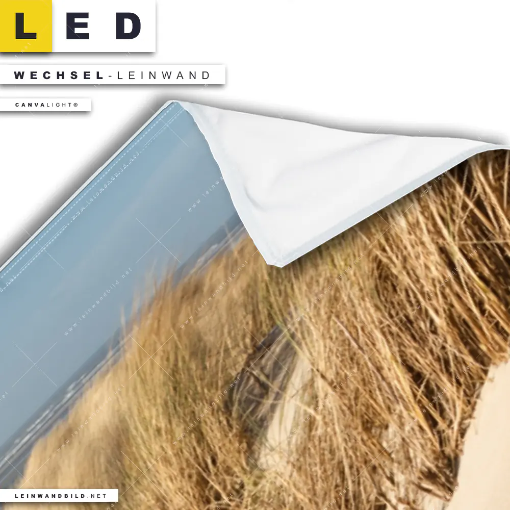 Du bist auf der Suche nach einer Landschaften, Strand - Meer Wechsel-Leinwand für Dein LED-Leinwandbild im Panorama-Format? Begriffe wie Deutschland, Sommer, Weg, Dünen, Gräser, Urlaub, Reisen, Nordsee, Ostsee, Steg, Küste, Sand, Meer, Strand haben Dich auf der Suche nach Deiner Ersatz-Leinwand für dein extra breites LED Wandbild mit wechselbarer Leinwand inspiriert? Farben wie Beige, Blau, Braun dürfen auf Deinem neuen Wechselmotiv für Dein XXL Leinwand-LED-Bild nicht fehlen und Leinwände im Natürlich - Realistisch Stil für Leuchtbilder passen perfekt zu Deinem Einrichtungsstil?