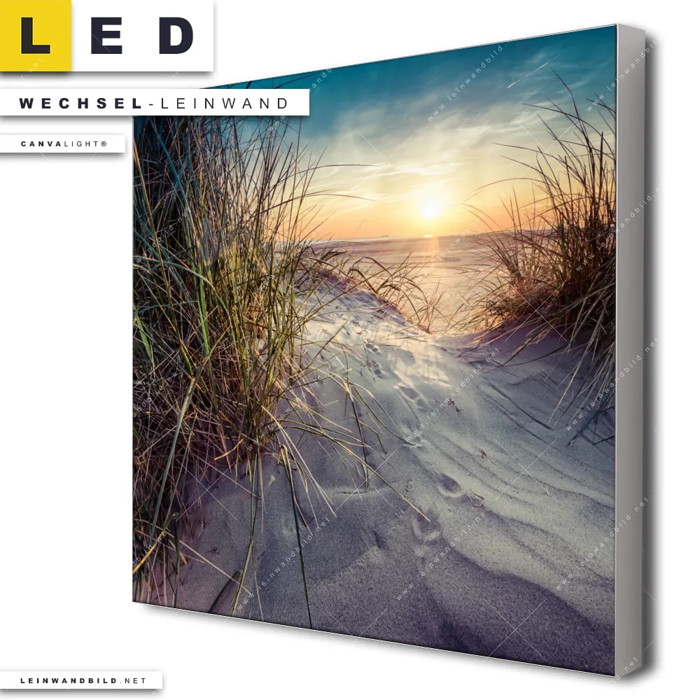 Du bist auf der Suche nach einer Landschaften, Strand - Meer Wechsel-Leinwand für Dein LED-Leinwandbild im Quadratischen Format? Begriffe wie Meer, Sonnenuntergang, Strand, Nordsee, Ostsee, Düne, Gras, Deutschland, Reise, Herbst, Sommer haben Dich auf der Suche nach Deiner Ersatz-Leinwand für dein LED Wandbild mit wechselbarer Leinwand inspiriert? Farben wie Beige, Blau, Grün, Hellgrün dürfen auf Deinem neuen Wechselmotiv für Dein XXL Leinwand-LED-Bild nicht fehlen und Leinwände im Retro - Vintage Stil für Leuchtbilder passen perfekt zu Deinem Einrichtungsstil?