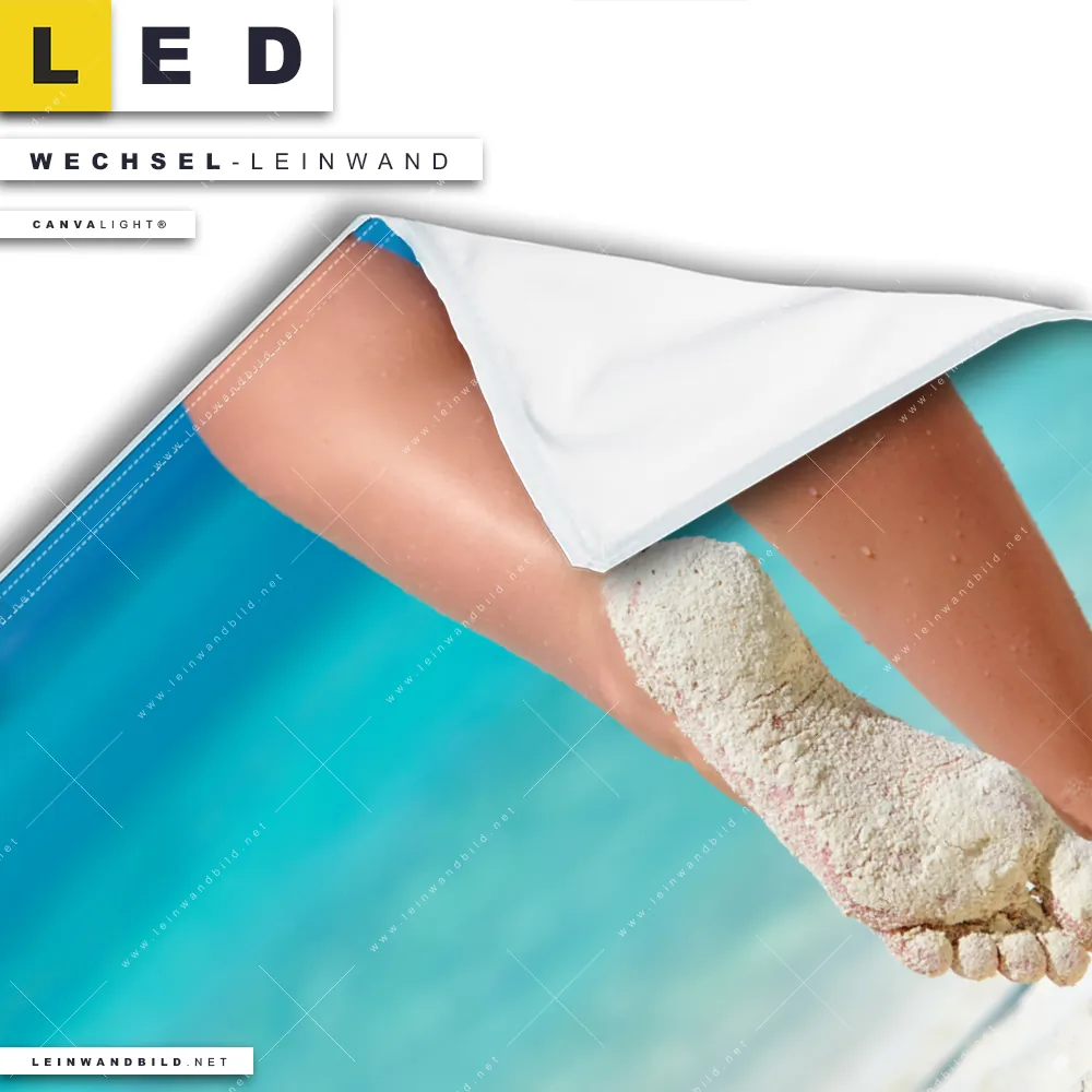 Du bist auf der Suche nach einer Strand - Meer, Porträts - Menschen Wechsel-Leinwand für Dein LED-Leinwandbild im Quadratischen Format? Begriffe wie Frau, Strand, Meer, Fuß, Sommer, Südsee - Karibik, Urlaub - Reisen haben Dich auf der Suche nach Deiner Ersatz-Leinwand für dein LED Wandbild mit wechselbarer Leinwand inspiriert? Farben wie Blau, Türkis, Weiss, Beige dürfen auf Deinem neuen Wechselmotiv für Dein XXL Leinwand-LED-Bild nicht fehlen und Leinwände im Natürlich - Realistisch Stil für Leuchtbilder passen perfekt zu Deinem Einrichtungsstil?