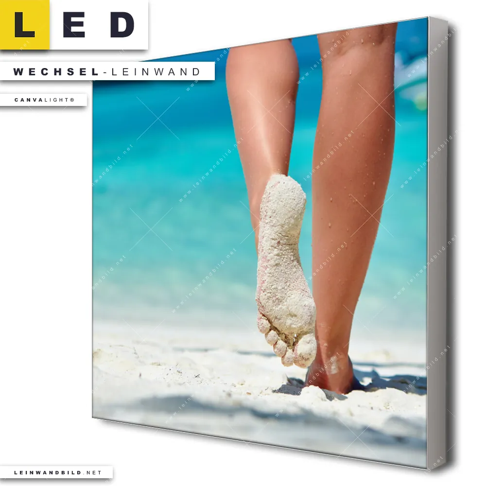 Dann sollte die Wechsel-Leinwand Canvalight® TEX | Strandspaziergang | Quadrat den Weg zu Dir finden. Die Austausch-Leinwand Frau mit nackten Füßen am tropisch weißen Strand - passend für unsere stufenlos dimmbaren, steckerfertigen Leinwandbilder im Leuchtrahmen mit Fernbedienung und optionaler Farbtemperatursteuerung - fügt sich als Eye-Catcher harmonisch in jedes Badezimmer, Arzt - Praxis, Büro - Kanzlei, Wohnzimmer - Schlafzimmer, Flur - Eingangsbereich, Bar - Gastronomie Raumkonzept ein.