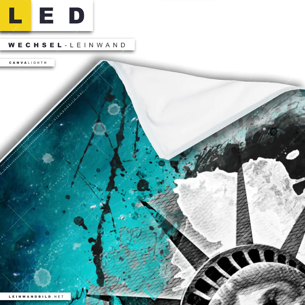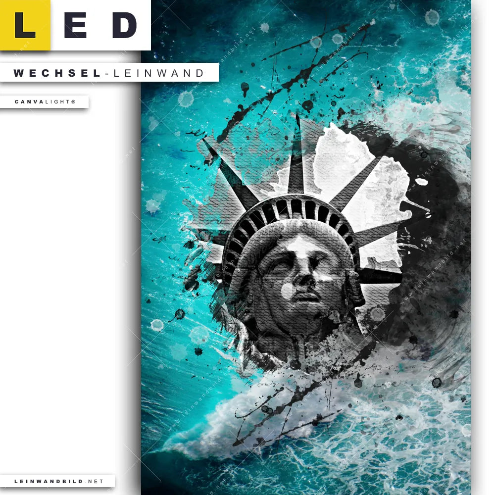 Auf der Suche nach Deinem neuen Wechselmotiv für LED Bilder mit austauschbarer Textil-Leinwand haben Dich Begriffe wie Grunge, Streetart, modern, Freiheitsstatue, Statue of Liberty, Amerika, USA, Meer, Ozean, Wellen inspiriert? Dann sollte die Wechsel-Leinwand Meereswogen treffen Freiheitsstatue für Canvalight® TEX LED Leuchtbilder den Weg zu Dir finden.