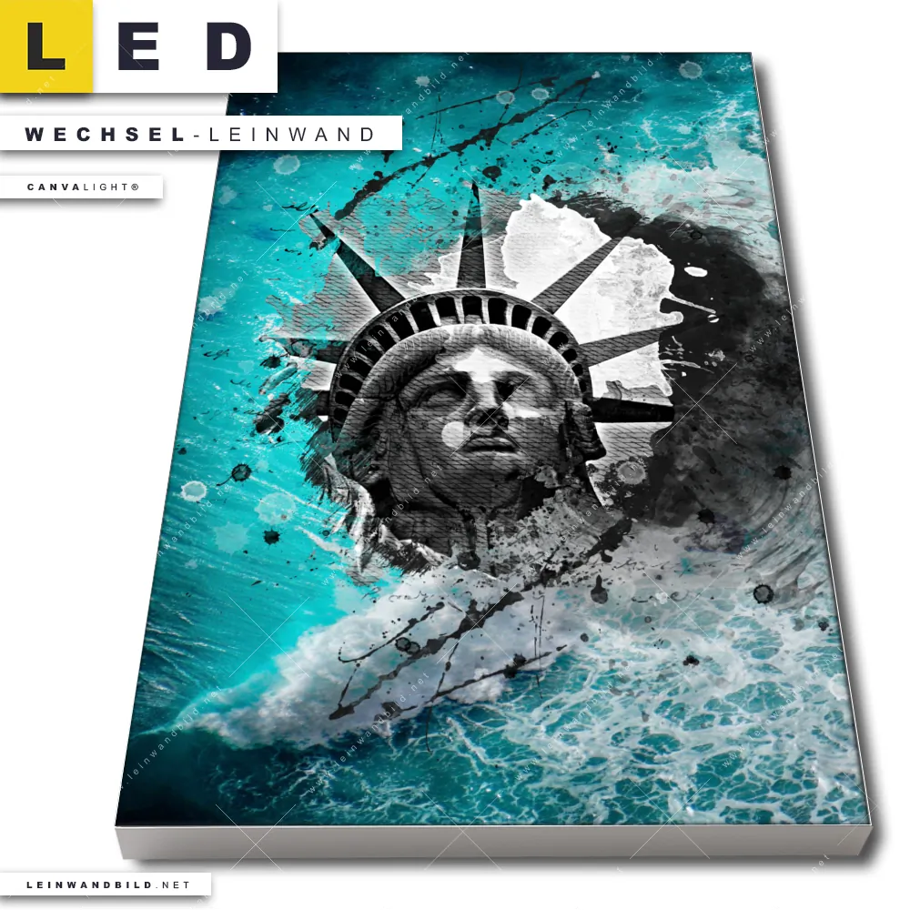 Du bist auf der Suche nach einer Städte - Skylines, Strand - Meer Wechsel-Leinwand für Dein LED-Leinwandbild im Hochformat? Begriffe wie Grunge, Streetart, modern, Freiheitsstatue, Statue of Liberty, Amerika, USA, Meer, Ozean, Wellen haben Dich auf der Suche nach Deiner Ersatz-Leinwand für dein LED Wandbild mit wechselbarer Leinwand inspiriert? Farben wie Türkis, Grau , Schwarz dürfen auf Deinem neuen Wechselmotiv für Dein XXL Leinwand-LED-Bild nicht fehlen und Leinwände im Abstrakt, Grunge, Mixed Media, Modern Art Stil für Leuchtbilder passen perfekt zu Deinem Einrichtungsstil?