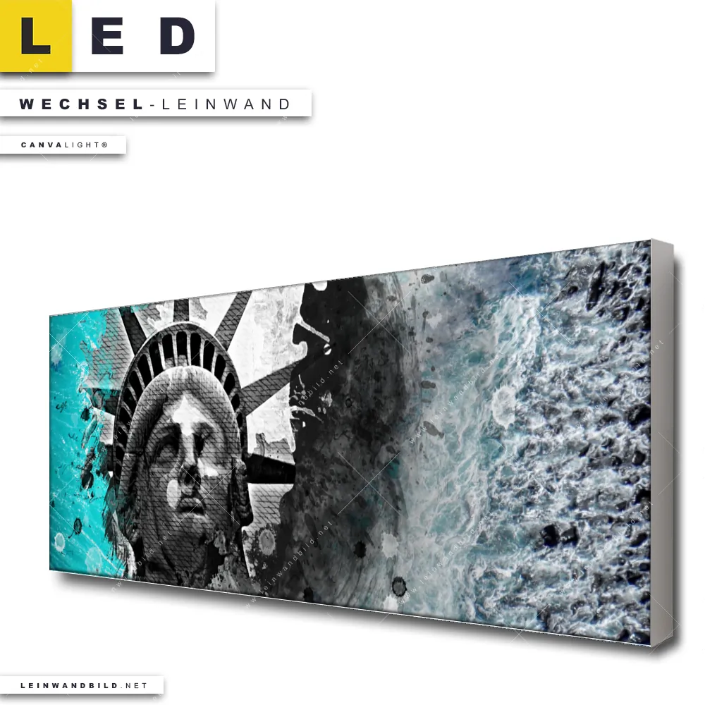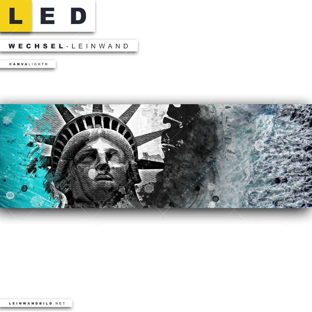 Du bist auf der Suche nach einer Städte - Skylines, Strand - Meer Wechsel-Leinwand für Dein LED-Leinwandbild im Panorama-Format? Begriffe wie Grunge, Streetart, modern, Freiheitsstatue, Statue of Liberty, Amerika, USA, Meer, Ozean, Wellen haben Dich auf der Suche nach Deiner Ersatz-Leinwand für dein extra breites LED Wandbild mit wechselbarer Leinwand inspiriert? Farben wie Türkis, Grau , Schwarz dürfen auf Deinem neuen Wechselmotiv für Dein XXL Leinwand-LED-Bild nicht fehlen und Leinwände im Abstrakt, Grunge, Mixed Media, Modern Art Stil für Leuchtbilder passen perfekt zu Deinem Einrichtungsstil?