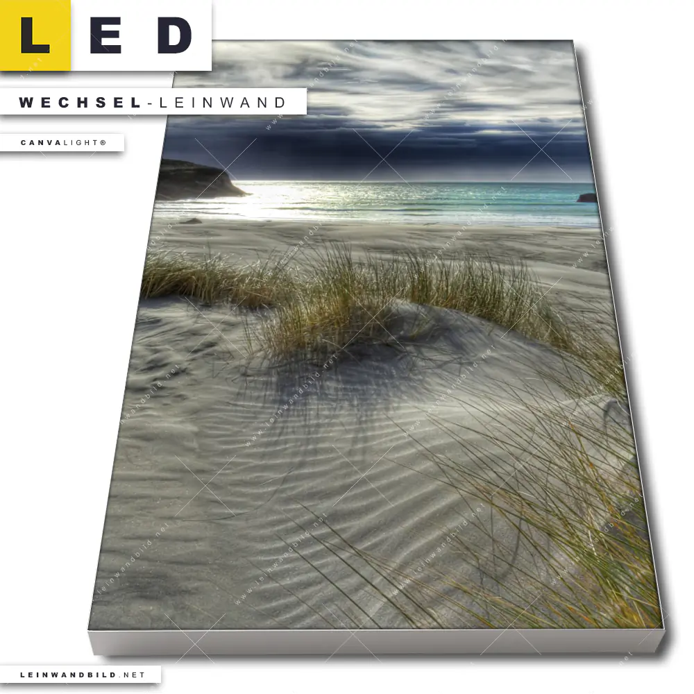 Auf der Suche nach Deinem neuen Wechselmotiv für LED Bilder mit austauschbarer Textil-Leinwand haben Dich Begriffe wie Sommer, Bucht, Meer, Urlaub, Reisen, Nordsee, Ostsee, Dünen, Gräser, Felsen, Küste, Steine, Horizont inspiriert? Dann sollte die Wechsel-Leinwand Einsame Dünen am Meer für Canvalight® TEX LED Leuchtbilder den Weg zu Dir finden.