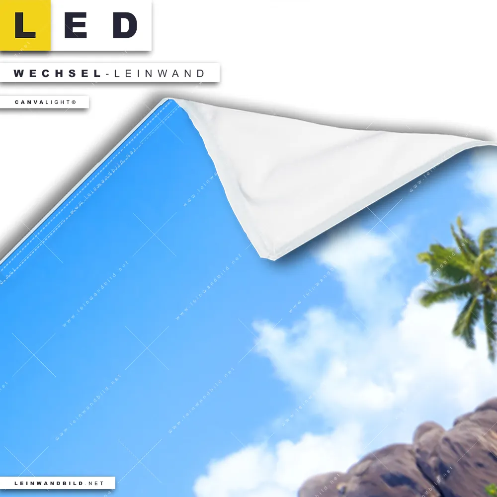 Du konfigurierst Deine individuelle LED Wechsel-Leinwand Canvalight® TEX | Südsee Paradies | Schmal und wir produzieren sie NEU für Dich. Unsere Landschaften, Strand - Meer Austausch-Fotoleinwände für Canvalight® LED Bilder sind KEINE Lagerware. Du bist Dir unsicher, welches Motiv oder Format das richtige für dein individuelles LED Wechselmotiv auf Leinwand ist, dann helfen wir dir gerne weiter und beraten dich!