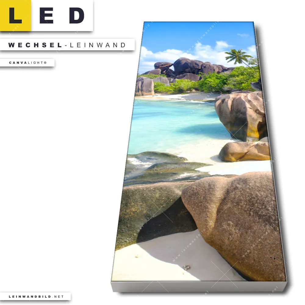 Dann sollte die Wechsel-Leinwand Canvalight® TEX | Südsee Paradies | Schmal den Weg zu Dir finden. Die Austausch-Leinwand Tropischer Sandstrand Seychellen - passend für unsere stufenlos dimmbaren, steckerfertigen Leinwandbilder im LED Leuchtrahmen mit Fernbedienung und optionaler Farbtemperatursteuerung - fügt sich als Eye-Catcher harmonisch in jedes Arzt - Praxis, Bar - Gastronomie, Büro - Kanzlei, Wohnzimmer - Schlafzimmer Raumkonzept ein.