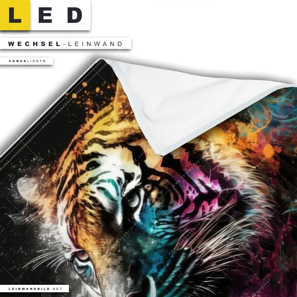 Du konfigurierst Deine individuelle LED Wechsel-Leinwand Canvalight® TEX | Tiger im Farbrausch | Quadrat und wir produzieren sie NEU für Dich. Unsere Tierwelt Austausch-Fotoleinwände für Canvalight® LED Bilder sind KEINE Lagerware. Du bist Dir unsicher, welches Motiv oder Format das richtige für dein individuelles LED Wechselmotiv auf Leinwand ist, dann helfen wir dir gerne weiter und beraten dich!