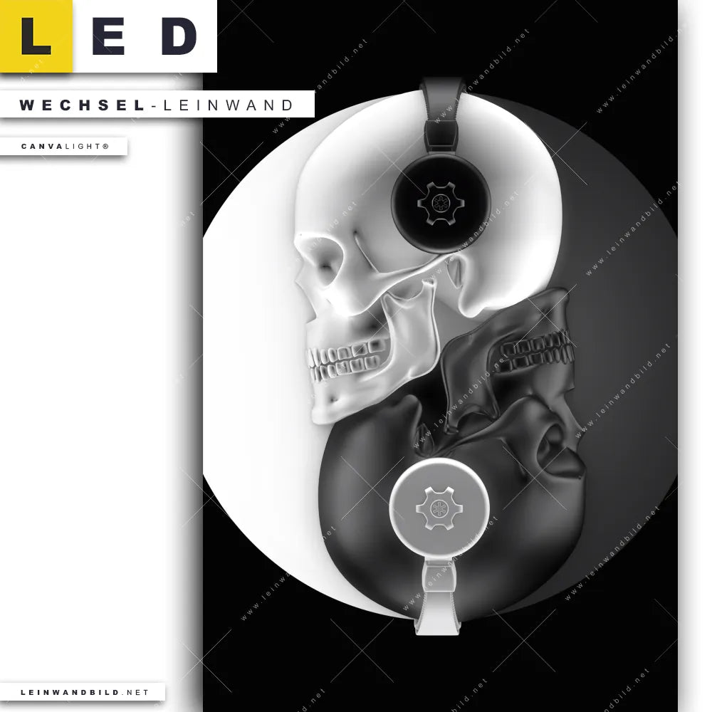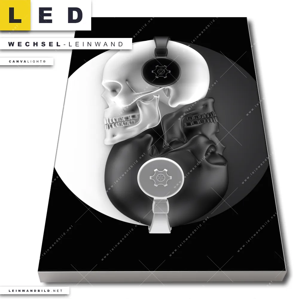 Dann sollte die Wechsel-Leinwand Canvalight® TEX | Totenkopf Yin Yang | Hochformat den Weg zu Dir finden. Die Austausch-Leinwand Yin & Yang als modernes Totenkopfbild - passend für unsere stufenlos dimmbaren, steckerfertigen Leinwandbilder im Leuchtrahmen mit Fernbedienung und optionaler Farbtemperatursteuerung - fügt sich als Eye-Catcher harmonisch in jedes Wohnzimmer - Schlafzimmer, Flur - Eingangsbereich Raumkonzept ein.