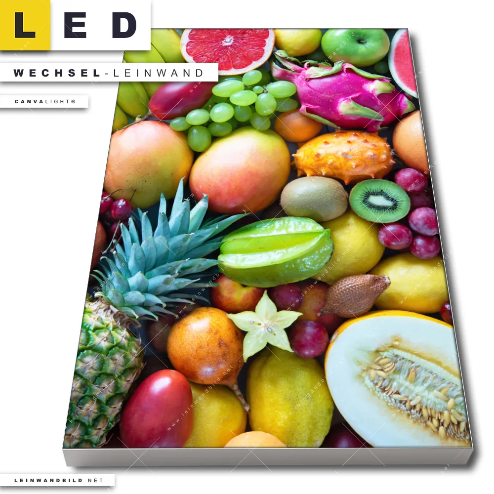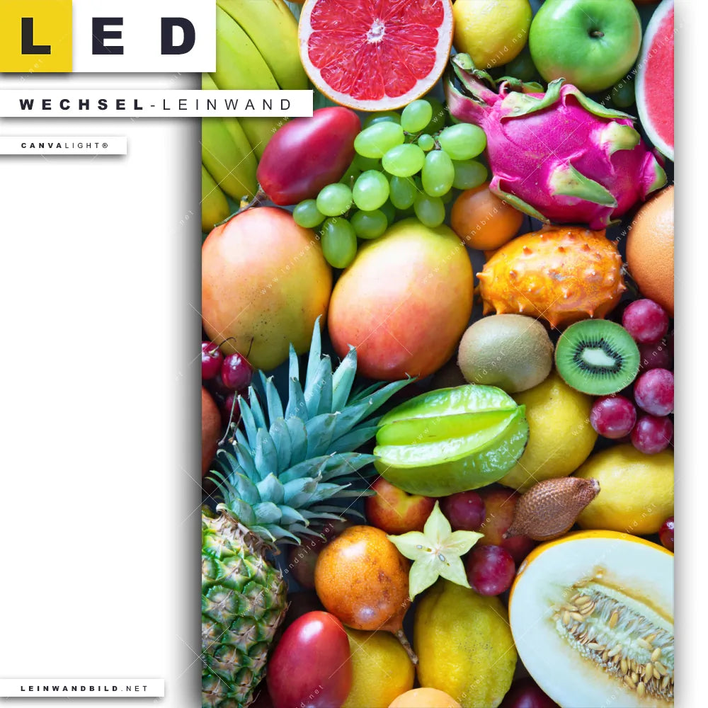 Du bist auf der Suche nach einer Essen - Trinken Wechsel-Leinwand für Dein LED-Leinwandbild im Hochformat? Begriffe wie Obst, Zitrusfrüchte, Früchte, Kiwi, frisch, Banane, Ananas, Kokosnuss, Tropfen, Orange, Mango haben Dich auf der Suche nach Deiner Ersatz-Leinwand für dein LED Wandbild mit wechselbarer Leinwand inspiriert? Farben wie Bunt dürfen auf Deinem neuen Wechselmotiv für Dein XXL Leinwand-LED-Bild nicht fehlen und Leinwände im Natürlich - Realistisch Stil für Leuchtbilder passen perfekt zu Deinem Einrichtungsstil?