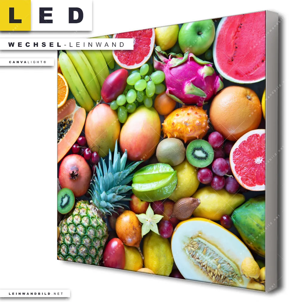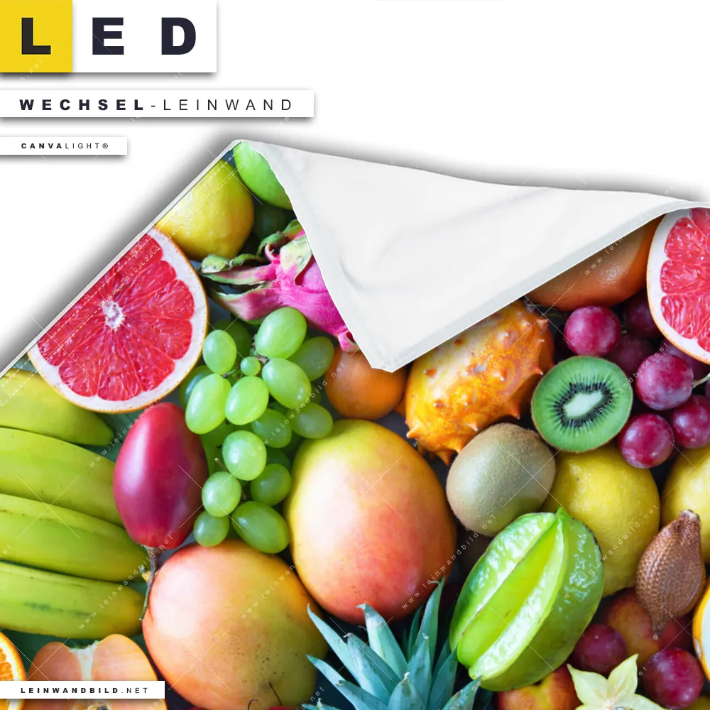 Du bist auf der Suche nach einer Essen - Trinken Wechsel-Leinwand für Dein LED-Leinwandbild im Quadratischen Format? Begriffe wie Obst, Zitrusfrüchte, Früchte, Kiwi, frisch, Banane, Ananas, Kokosnuss, Tropfen, Orange, Mango haben Dich auf der Suche nach Deiner Ersatz-Leinwand für dein LED Wandbild mit wechselbarer Leinwand inspiriert? Farben wie Bunt dürfen auf Deinem neuen Wechselmotiv für Dein XXL Leinwand-LED-Bild nicht fehlen und Leinwände im Natürlich - Realistisch Stil für Leuchtbilder passen perfekt zu Deinem Einrichtungsstil?