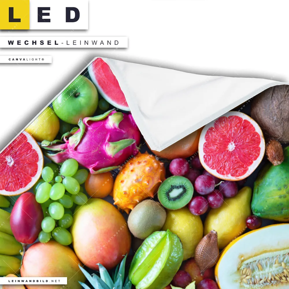 Bitte beachte, dass die Farben, der auf dem Monitor abgebildeten exotisches Obst Darstellung, möglicherweise von den Originalfarben deiner Canvalight® TEX Wechsel-Leinwand abweichen können.