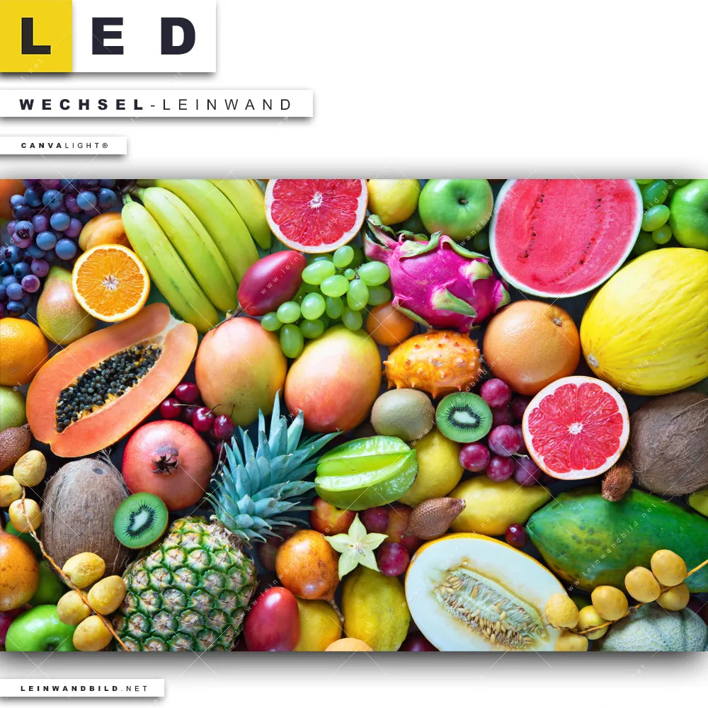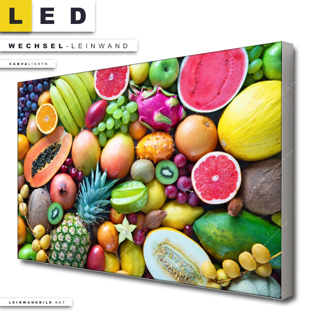 Du bist auf der Suche nach einer Essen - Trinken Wechsel-Leinwand für Dein LED-Leinwandbild im Querformat? Begriffe wie Obst, Zitrusfrüchte, Früchte, Kiwi, frisch, Banane, Ananas, Kokosnuss, Tropfen, Orange, Mango haben Dich auf der Suche nach Deiner Ersatz-Leinwand für dein breites LED Wandbild mit wechselbarer Leinwand inspiriert? Farben wie Bunt dürfen auf Deinem neuen Wechselmotiv für Dein XXL Leinwand-LED-Bild nicht fehlen und Leinwände im Natürlich - Realistisch Stil für Leuchtbilder passen perfekt zu Deinem Einrichtungsstil?
