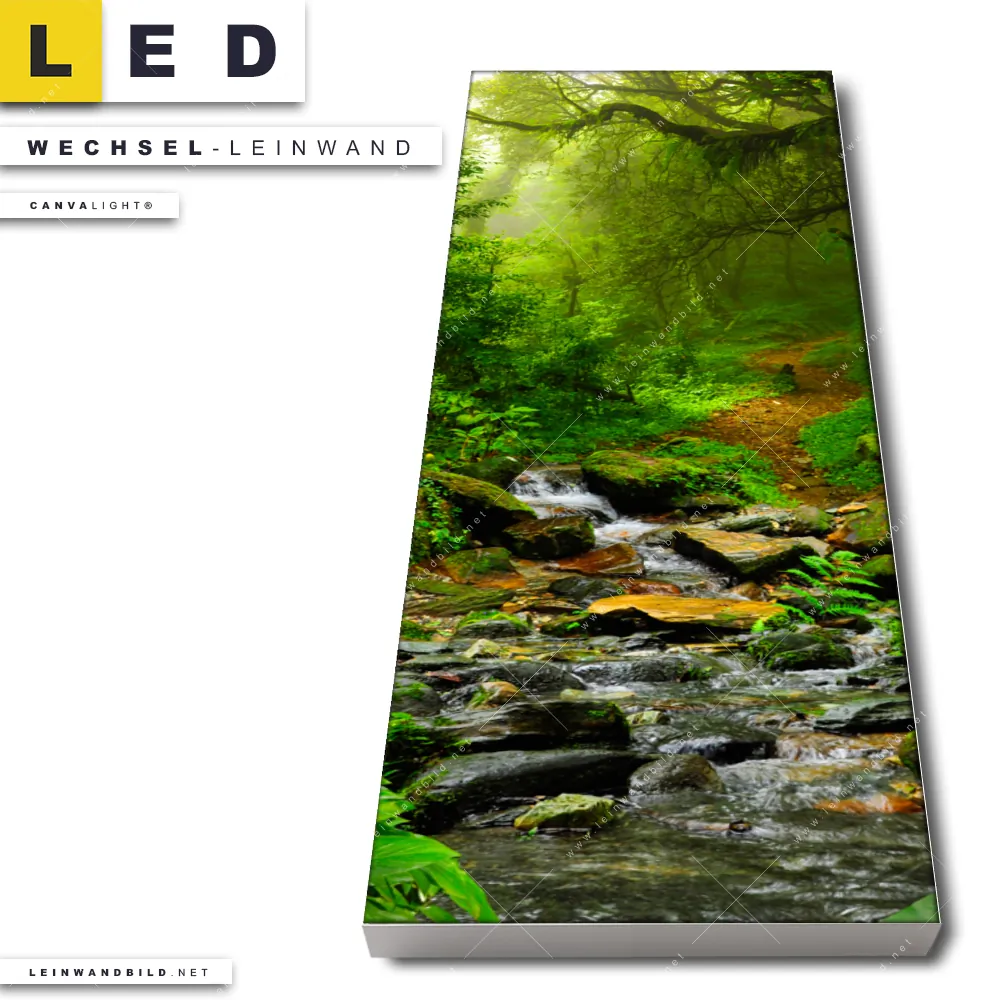 Dann sollte die Wechsel-Leinwand Canvalight® TEX | Tropischer Dschungel | Schmal den Weg zu Dir finden. Die Austausch-Leinwand Wasserlauf im Regenwald - passend für unsere stufenlos dimmbaren, steckerfertigen Leinwandbilder im LED Leuchtrahmen mit Fernbedienung und optionaler Farbtemperatursteuerung - fügt sich als Eye-Catcher harmonisch in jedes Arzt - Praxis, Büro - Kanzlei, Wohnzimmer - Schlafzimmer Raumkonzept ein.