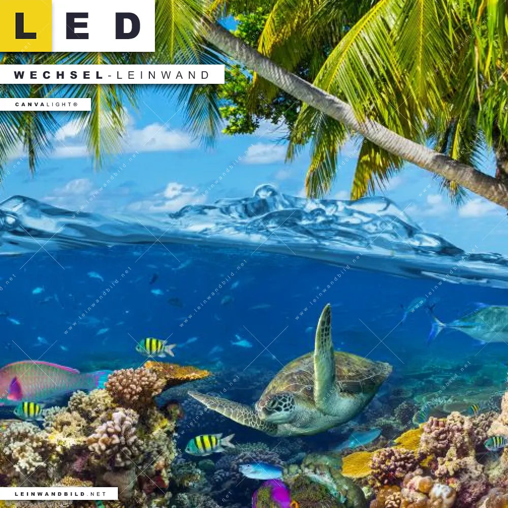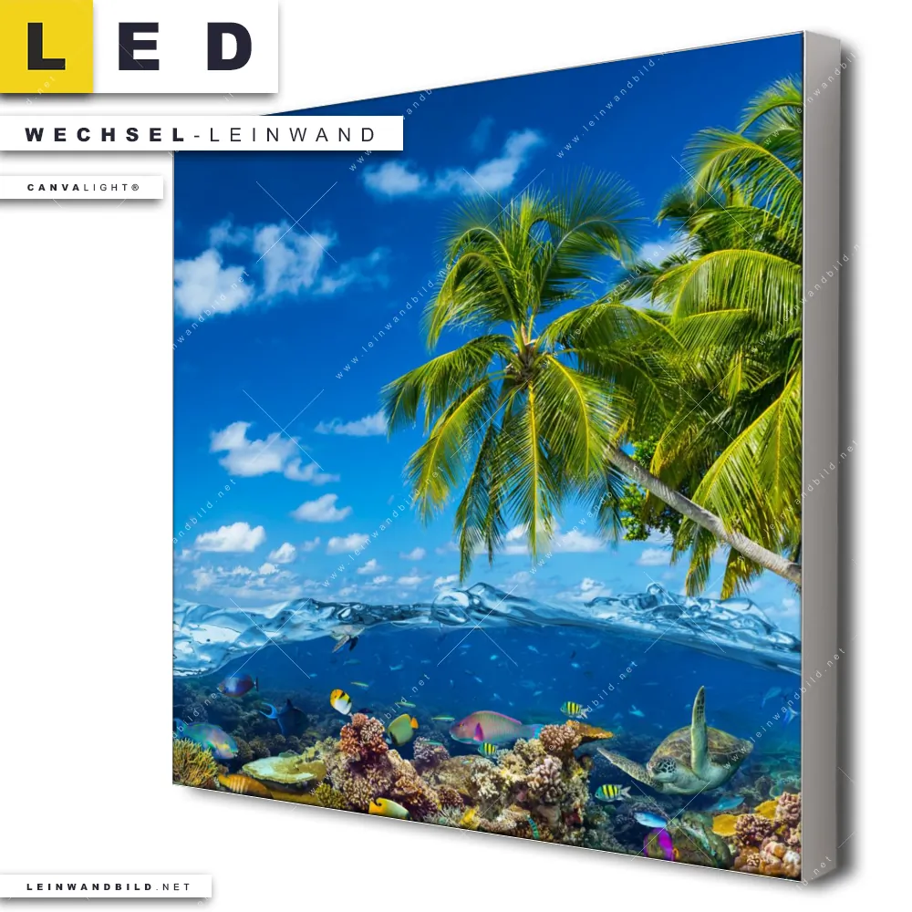 Dann sollte die Wechsel-Leinwand Canvalight® TEX | Tropisches Inselparadies | Quadrat den Weg zu Dir finden. Die Austausch-Leinwand Karibik-Traum mit Korallenriff - passend für unsere stufenlos dimmbaren, steckerfertigen Leinwandbilder im Leuchtrahmen mit Fernbedienung und optionaler Farbtemperatursteuerung - fügt sich als Eye-Catcher harmonisch in jedes Arzt - Praxis, Bar - Gastronomie, Wohnzimmer - Schlafzimmer Raumkonzept ein.