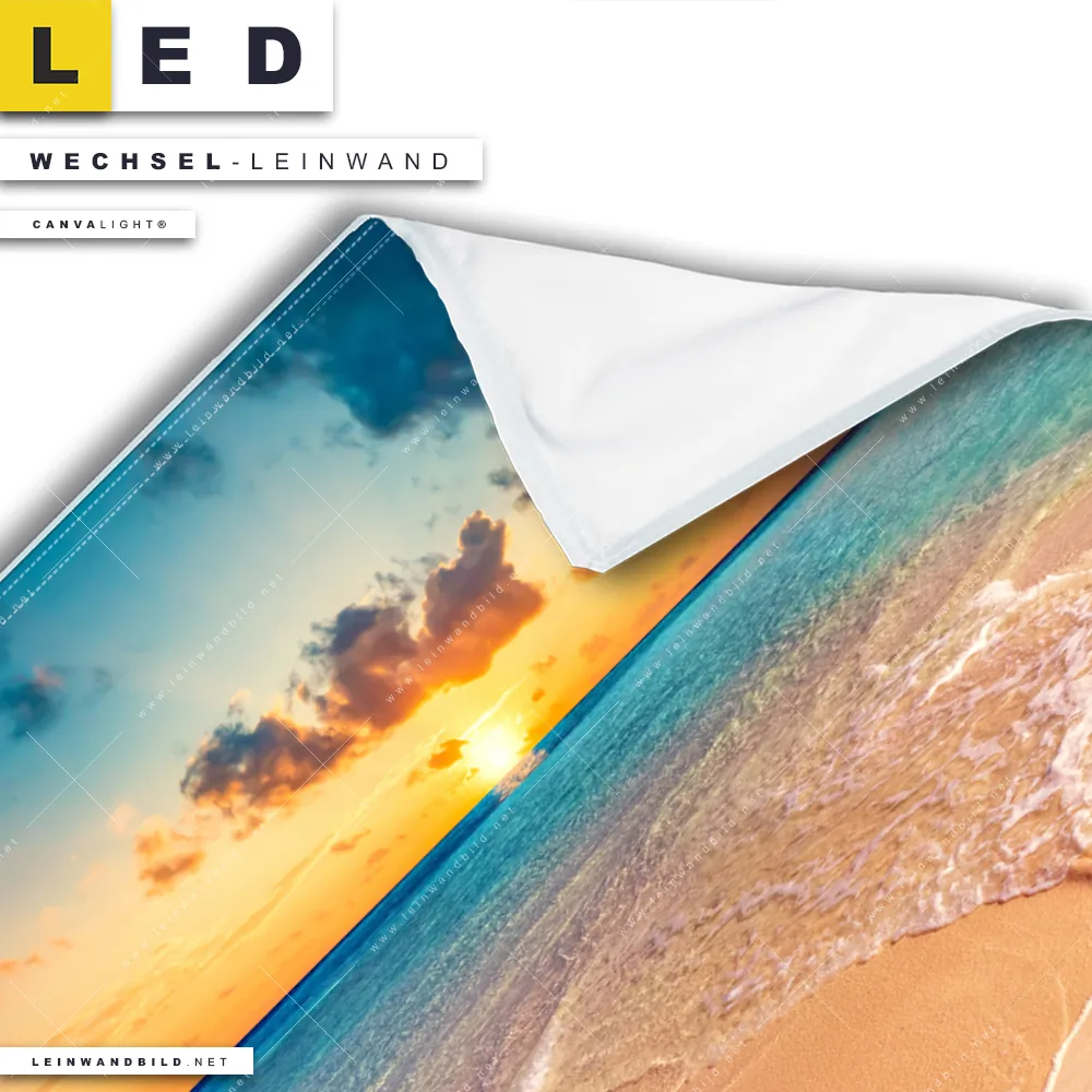 Du bist auf der Suche nach einer Strand - Meer, Landschaften Wechsel-Leinwand für Dein LED-Leinwandbild im Quadratischen Format? Begriffe wie Ozean, Wasser, Küste, Horizont, Sand, Sonne, Nordsee, Ostsee, Mittelmeer, Insel, Malediven, Südsee - Karibik, Urlaub - Reisen, Sonnenuntergang - Sonnenaufgang haben Dich auf der Suche nach Deiner Ersatz-Leinwand für dein LED Wandbild mit wechselbarer Leinwand inspiriert? Farben wie Blau, Hellblau, Orange, Beige, Türkis dürfen auf Deinem neuen Wechselmotiv für Dein XXL Leinwand-LED-Bild nicht fehlen und Leinwände im Natürlich - Realistisch, Modern Art Stil für Leuchtbilder passen perfekt zu Deinem Einrichtungsstil?
