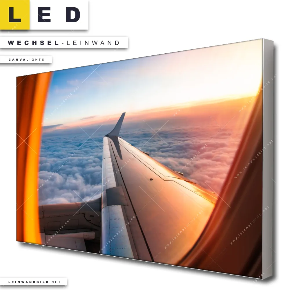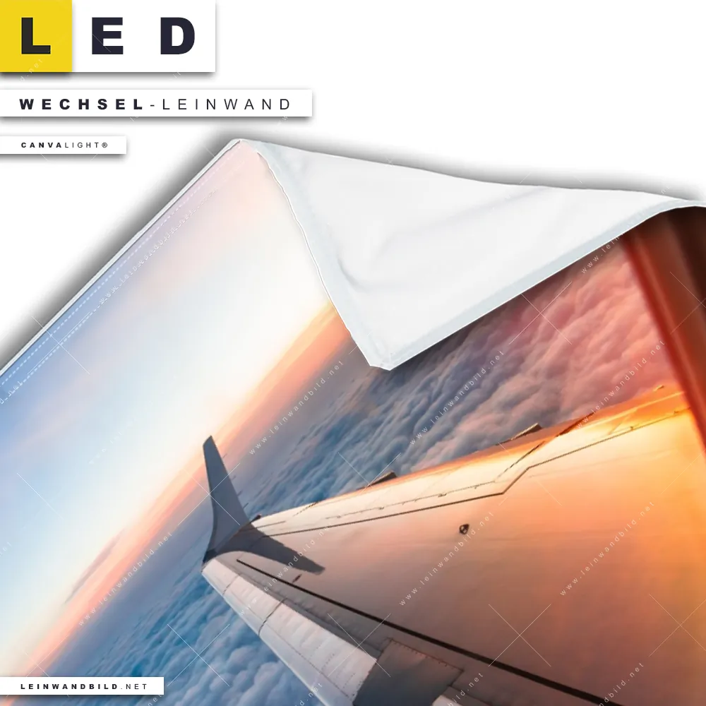 Du bist auf der Suche nach einer Fensterblick Wechsel-Leinwand für Dein LED-Leinwandbild im Querformat? Begriffe wie Urlaub, Reisen, Wolken, Flugzeug, fliegen, Fensterblick, über den Wolken haben Dich auf der Suche nach Deiner Ersatz-Leinwand für dein breites LED Wandbild mit wechselbarer Leinwand inspiriert? Farben wie Blau, Orange dürfen auf Deinem neuen Wechselmotiv für Dein XXL Leinwand-LED-Bild nicht fehlen und Leinwände im Natürlich - Realistisch Stil für Leuchtbilder passen perfekt zu Deinem Einrichtungsstil?