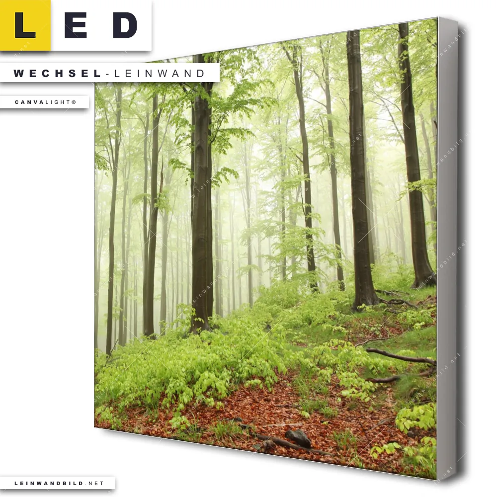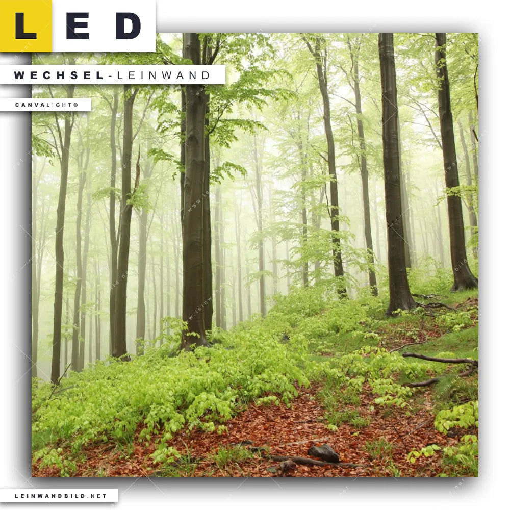 Dann sollte die Wechsel-Leinwand Canvalight® TEX | Unberührte Natur - Der Wald | Quadrat den Weg zu Dir finden. Die Austausch-Leinwand Wald mit Buchen - passend für unsere stufenlos dimmbaren, steckerfertigen Leinwandbilder im Leuchtrahmen mit Fernbedienung und optionaler Farbtemperatursteuerung - fügt sich als Eye-Catcher harmonisch in jedes Wohnzimmer - Schlafzimmer, Arzt - Praxis, Büro - Kanzlei, Flur - Eingangsbereich Raumkonzept ein.