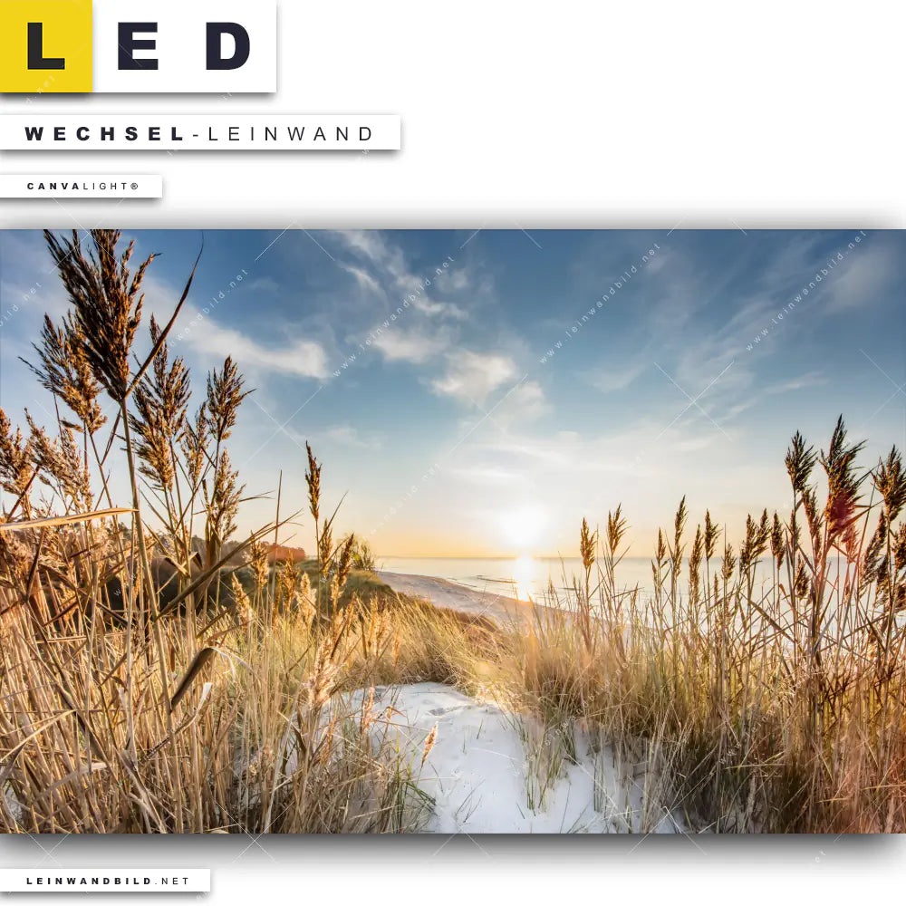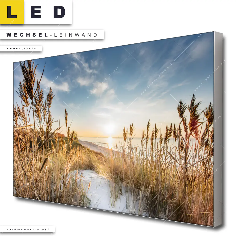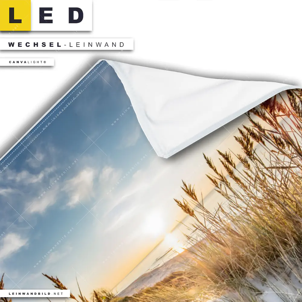 Du bist auf der Suche nach einer Landschaften, Strand - Meer Wechsel-Leinwand für Dein LED-Leinwandbild im Querformat? Begriffe wie Deutschland, Sommer, Dünen, Gräser, Urlaub, Reisen, Ostsee, Nordsee, Strand, Meer, Sonnenuntergang, Sonnenaufgang haben Dich auf der Suche nach Deiner Ersatz-Leinwand für dein breites LED Wandbild mit wechselbarer Leinwand inspiriert? Farben wie Beige, Blau, Braun dürfen auf Deinem neuen Wechselmotiv für Dein XXL Leinwand-LED-Bild nicht fehlen und Leinwände im Retro - Vintage, Natürlich - Realistisch Stil für Leuchtbilder passen perfekt zu Deinem Einrichtungsstil?