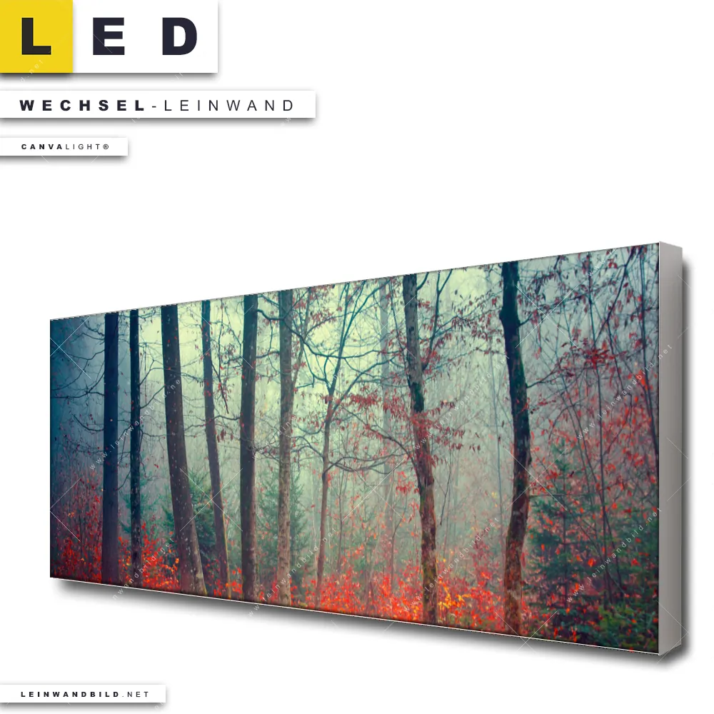 Dann sollte die Wechsel-Leinwand Canvalight® TEX | Verträumter Wald | Panorama den Weg zu Dir finden. Die Austausch-Leinwand Herbstlicher Nebel im Wald - passend für unsere stufenlos dimmbaren, steckerfertigen Leinwandbilder im LED Leuchtrahmen mit Fernbedienung und optionaler Farbtemperatursteuerung - fügt sich als Eye-Catcher harmonisch in jedes Arzt - Praxis, Bar - Gastronomie, Büro - Kanzlei, Flur - Eingangsbereich, Wohnzimmer - Schlafzimmer Raumkonzept ein.