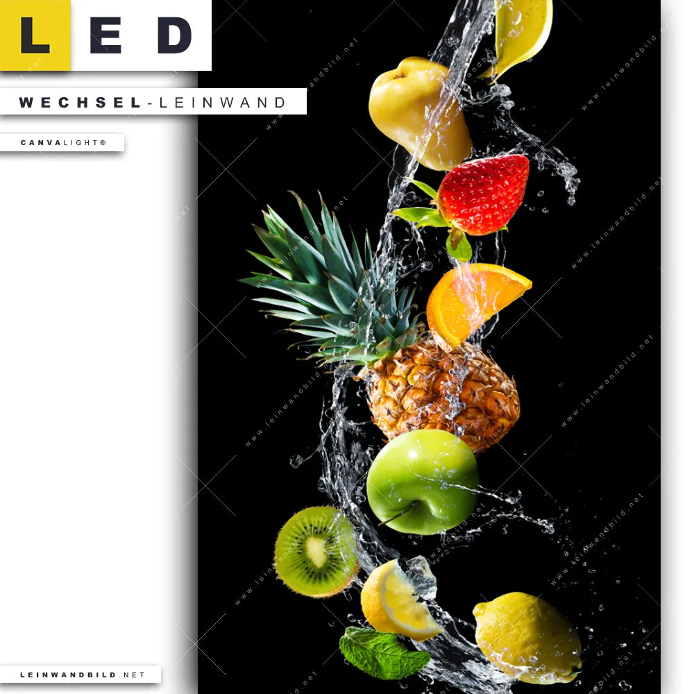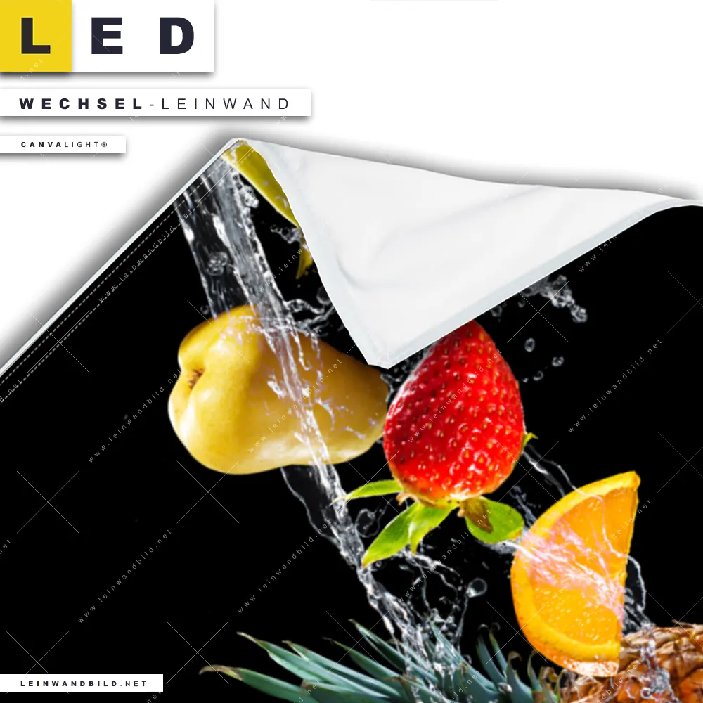 Du bist auf der Suche nach einer Essen - Trinken Wechsel-Leinwand für Dein LED-Leinwandbild im Hochformat? Begriffe wie Obst, Zitrusfrüchte, Früchte, Kiwi, frisch, spritzig, Banane, Ananas, Spritzwasser, Wasser, Spritzer, Kokosnuss, Tropfen, Wassertropfen haben Dich auf der Suche nach Deiner Ersatz-Leinwand für dein LED Wandbild mit wechselbarer Leinwand inspiriert? Farben wie Bunt, Schwarz dürfen auf Deinem neuen Wechselmotiv für Dein XXL Leinwand-LED-Bild nicht fehlen und Leinwände im Mixed Media, Modern Art Stil für Leuchtbilder passen perfekt zu Deinem Einrichtungsstil?