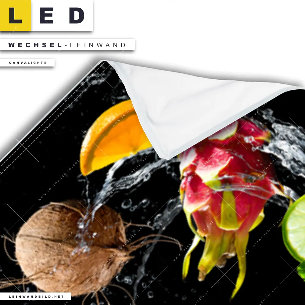 Du bist auf der Suche nach einer Essen - Trinken Wechsel-Leinwand für Dein LED-Leinwandbild im Schmalen Format? Begriffe wie Obst, Zitrusfrüchte, Früchte, Kiwi, frisch, spritzig, Banane, Ananas, Spritzwasser, Wasser, Spritzer, Kokosnuss, Tropfen, Wassertropfen haben Dich auf der Suche nach Deiner Ersatz-Leinwand für dein LED Wandbild im Panorama-Hochformat mit wechselbarer Leinwand inspiriert? Farben wie Bunt, Schwarz dürfen auf Deinem neuen Wechselmotiv für Dein XXL Leinwand-LED-Bild nicht fehlen und Leinwände im Mixed Media, Modern Art Stil für Leuchtbilder passen perfekt zu Deinem Einrichtungsstil?