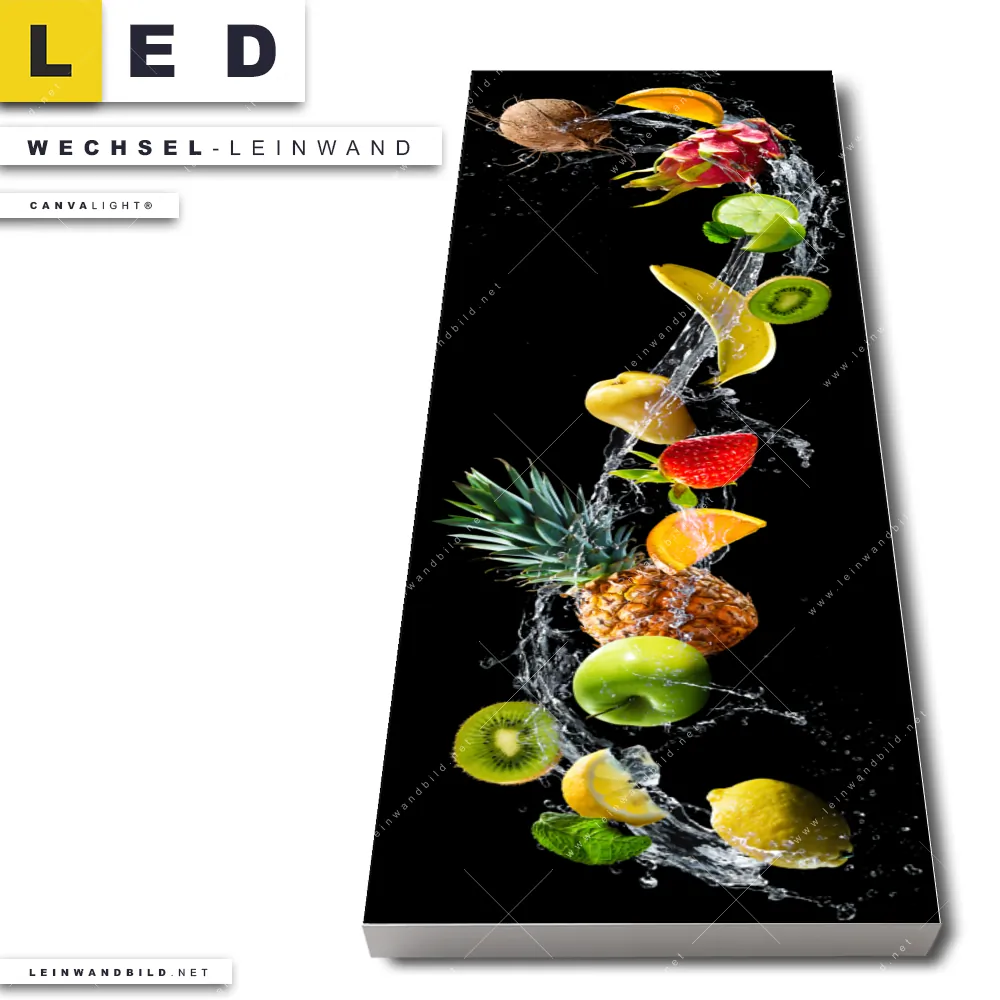 Dann sollte die Wechsel-Leinwand Canvalight® TEX | Viele Früchte | Schmal den Weg zu Dir finden. Die Austausch-Leinwand bunte Früchte im Wasserstrahl - passend für unsere stufenlos dimmbaren, steckerfertigen Leinwandbilder im LED Leuchtrahmen mit Fernbedienung und optionaler Farbtemperatursteuerung - fügt sich als Eye-Catcher harmonisch in jedes Bar - Gastronomie, Küche - Esszimmer Raumkonzept ein.