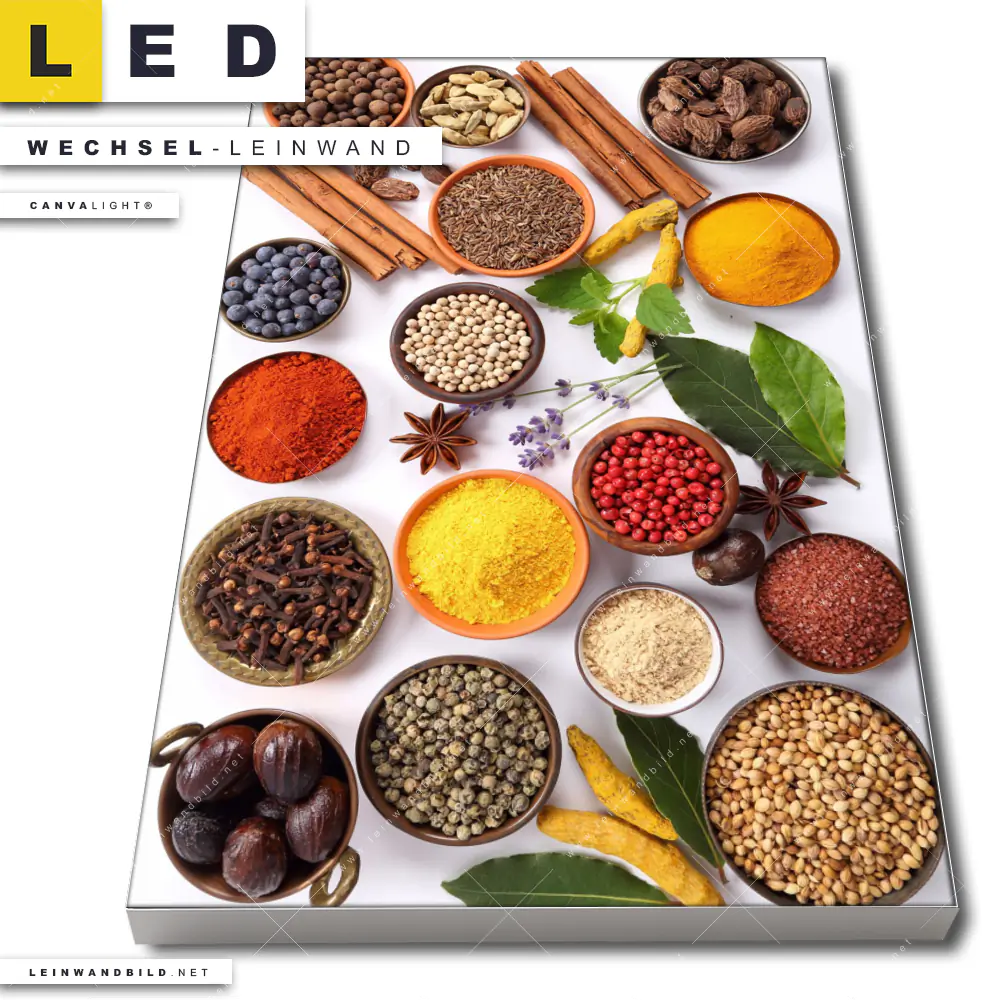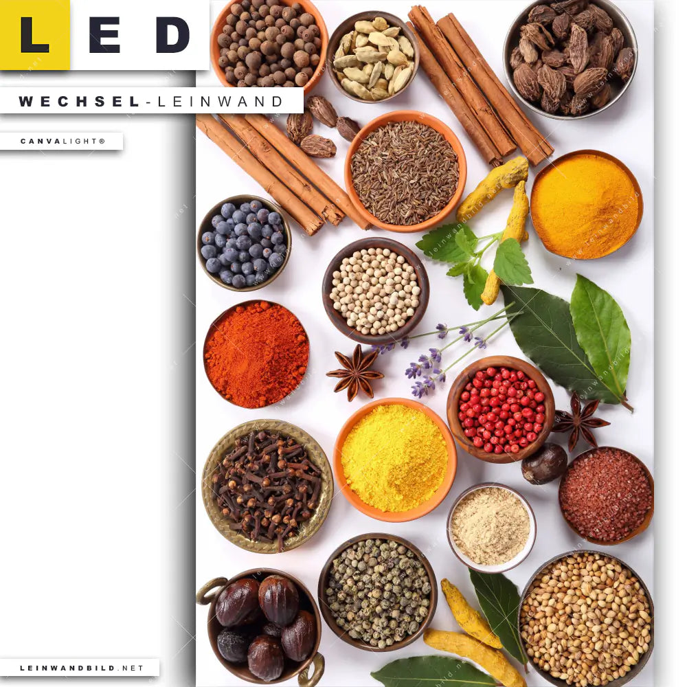 Du bist auf der Suche nach einer Essen - Trinken Wechsel-Leinwand für Dein LED-Leinwandbild im Hochformat? Begriffe wie Gewürze, Kräuter, Lebensmittel, Geschmack, Indien, Zimt, Curry, Paprika, kochen, Küche, Essen, Ernährung haben Dich auf der Suche nach Deiner Ersatz-Leinwand für dein LED Wandbild mit wechselbarer Leinwand inspiriert? Farben wie Braun, Grün, Rot, Beige dürfen auf Deinem neuen Wechselmotiv für Dein XXL Leinwand-LED-Bild nicht fehlen und Leinwände im Natürlich - Realistisch Stil für Leuchtbilder passen perfekt zu Deinem Einrichtungsstil?