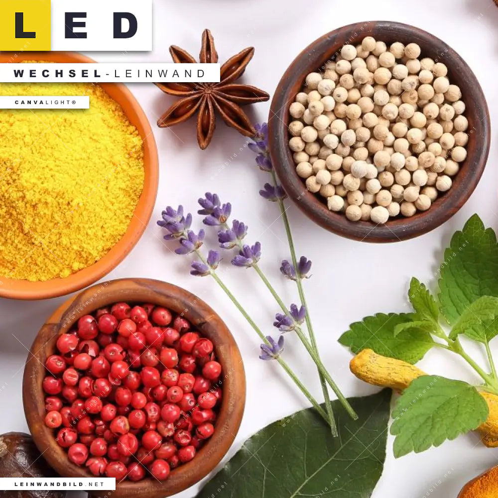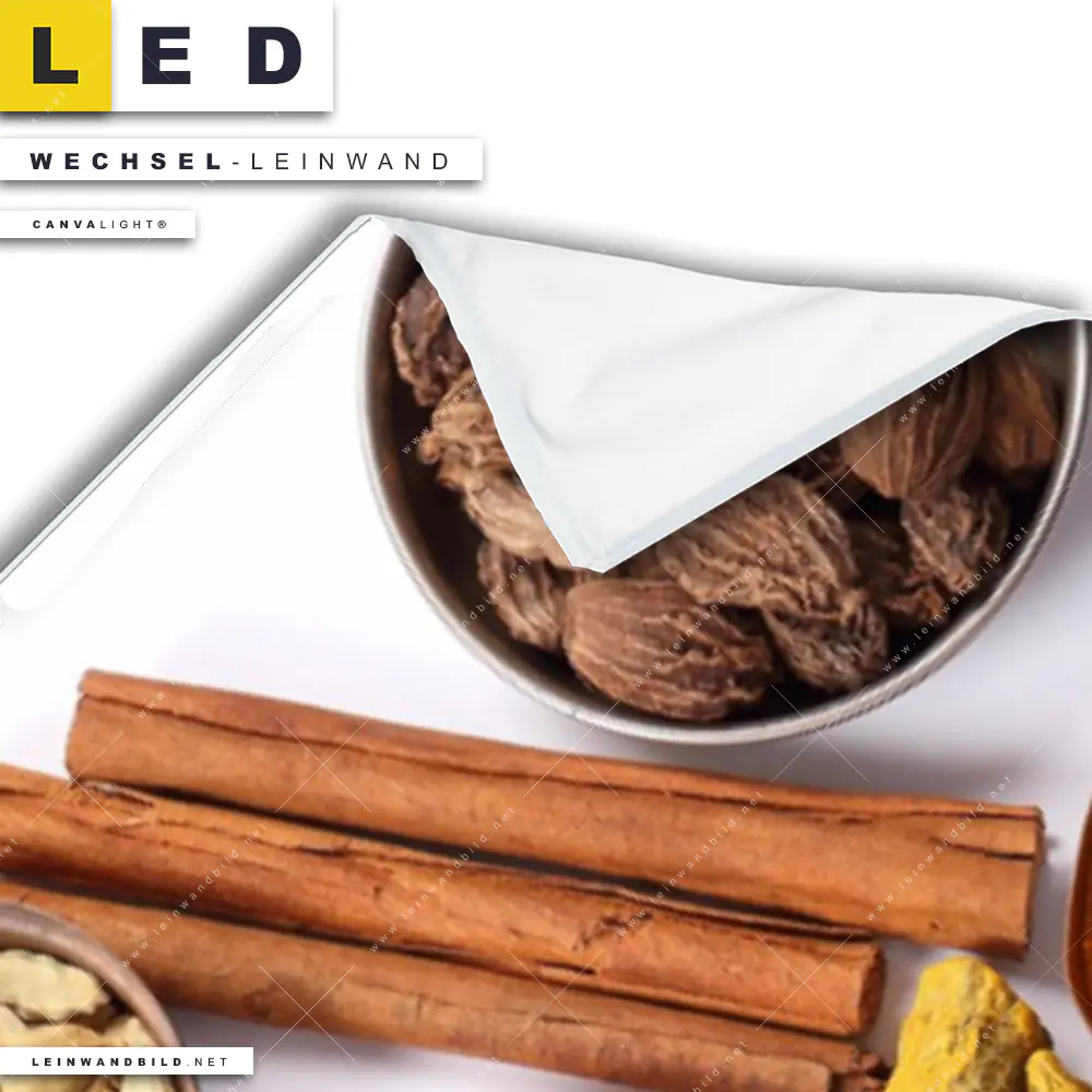 Du bist auf der Suche nach einer Essen - Trinken Wechsel-Leinwand für Dein LED-Leinwandbild im Schmalen Format? Begriffe wie Gewürze, Kräuter, Lebensmittel, Geschmack, Indien, Zimt, Curry, Paprika, kochen, Küche, Essen, Ernährung haben Dich auf der Suche nach Deiner Ersatz-Leinwand für dein LED Wandbild im Panorama-Hochformat mit wechselbarer Leinwand inspiriert? Farben wie Braun, Grün, Rot, Beige dürfen auf Deinem neuen Wechselmotiv für Dein XXL Leinwand-LED-Bild nicht fehlen und Leinwände im Natürlich - Realistisch Stil für Leuchtbilder passen perfekt zu Deinem Einrichtungsstil?