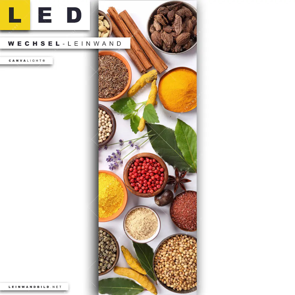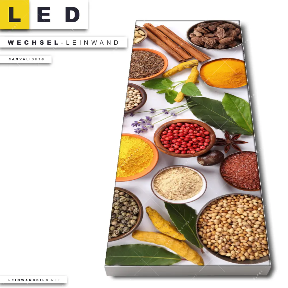 Du konfigurierst Deine individuelle LED Wechsel-Leinwand Canvalight® TEX | Vielfältige Gewürze | Schmal und wir produzieren sie NEU für Dich. Unsere Essen - Trinken Austausch-Fotoleinwände für Canvalight® LED Bilder sind KEINE Lagerware. Du bist Dir unsicher, welches Motiv oder Format das richtige für dein individuelles LED Wechselmotiv auf Leinwand ist, dann helfen wir dir gerne weiter und beraten dich!