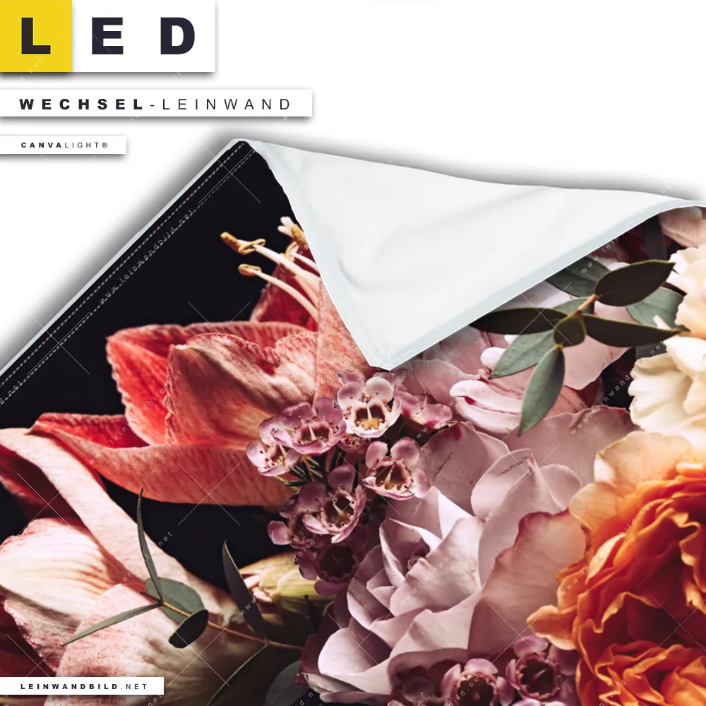 Bitte beachte, dass die Farben, der auf dem Monitor abgebildeten Blütenpracht in rot, rosa, organge und gelb Darstellung, möglicherweise von den Originalfarben deiner Canvalight® TEX Wechsel-Leinwand abweichen können.