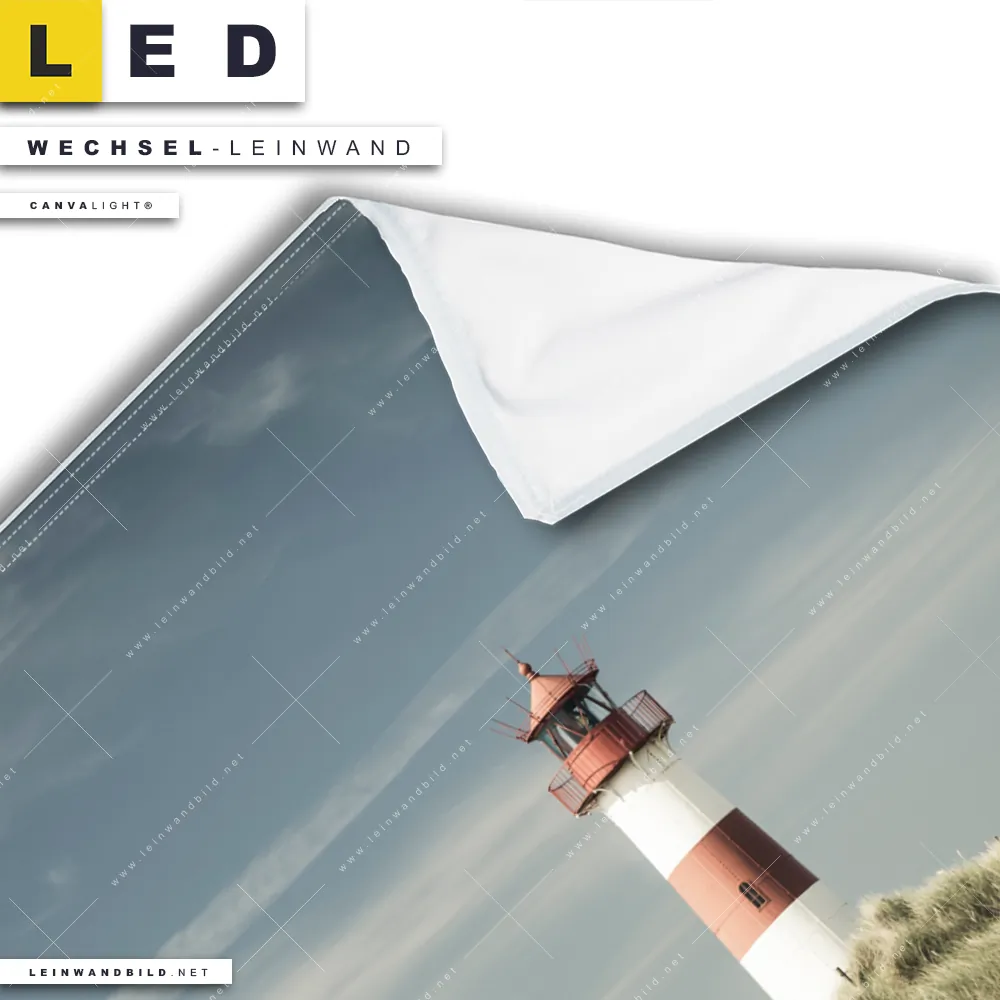 Bitte beachte, dass die Farben, der auf dem Monitor abgebildeten Rot-Weißer Leuchtturm am Strand Darstellung, möglicherweise von den Originalfarben deiner Canvalight® TEX Wechsel-Leinwand abweichen können.