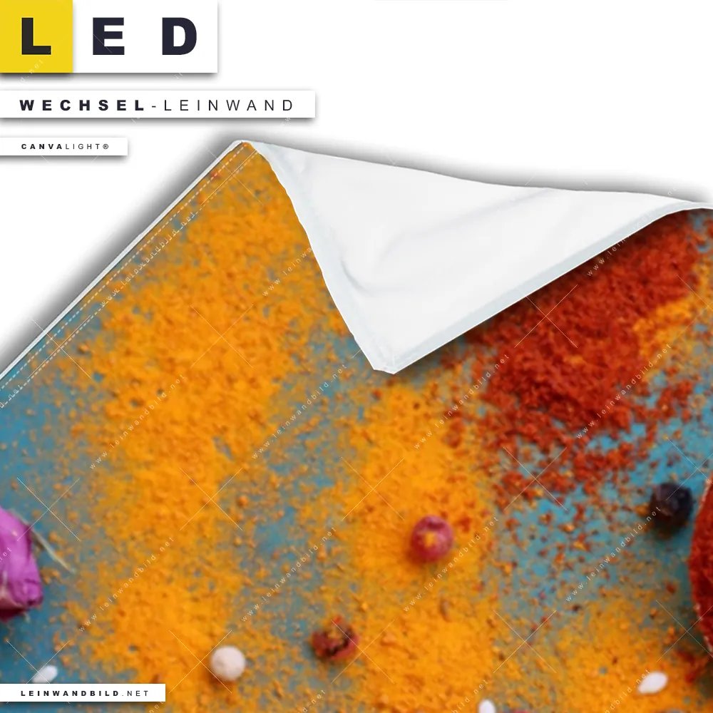 Du bist auf der Suche nach einer Essen - Trinken Wechsel-Leinwand für Dein LED-Leinwandbild im Schmalen Format? Begriffe wie Gewürze, Kräuter, Löffel, kochen, Silberlöffel, Lebensmittel, frisch, lecker, gesund, Zitrone, Curry haben Dich auf der Suche nach Deiner Ersatz-Leinwand für dein LED Wandbild im Panorama-Hochformat mit wechselbarer Leinwand inspiriert? Farben wie Blau, Silber, Orange dürfen auf Deinem neuen Wechselmotiv für Dein XXL Leinwand-LED-Bild nicht fehlen und Leinwände im Modern Art, Natürlich - Realistisch Stil für Leuchtbilder passen perfekt zu Deinem Einrichtungsstil?