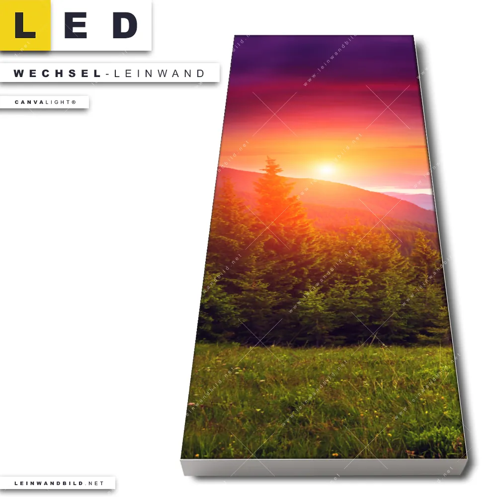 Du konfigurierst Deine individuelle LED Wechsel-Leinwand Canvalight® TEX | Wald bei Sonnenuntergang | Schmal und wir produzieren sie NEU für Dich. Unsere Landschaften, Wald - Bäume Austausch-Fotoleinwände für Canvalight® LED Bilder sind KEINE Lagerware. Du bist Dir unsicher, welches Motiv oder Format das richtige für dein individuelles LED Wechselmotiv auf Leinwand ist, dann helfen wir dir gerne weiter und beraten dich!