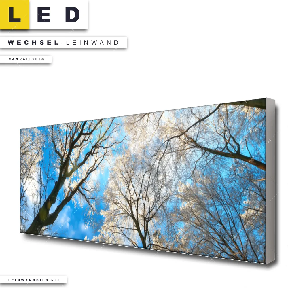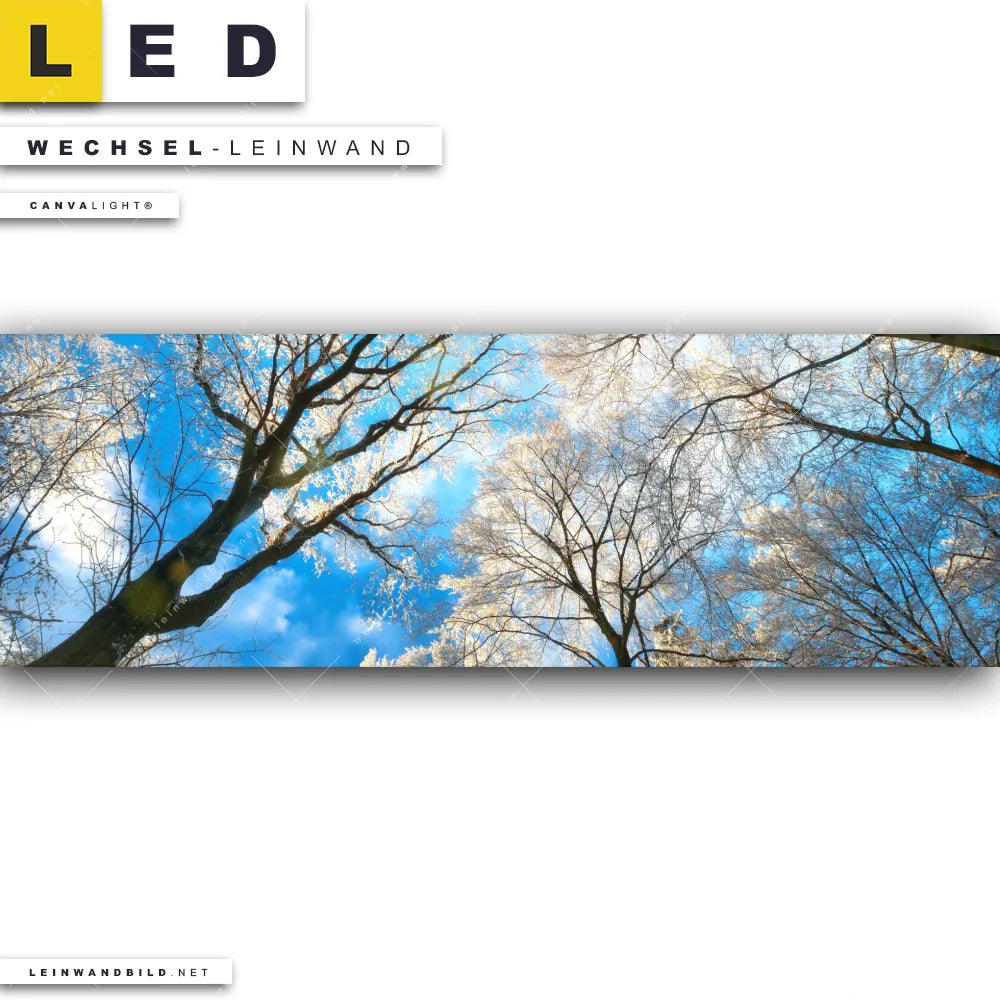 Du bist auf der Suche nach einer Wald - Bäume Wechsel-Leinwand für Dein LED-Leinwandbild im Panorama-Format? Begriffe wie Wald, Baum, Bäume, Natur, Baumkrone, Froschperspektive, Baumwipfel, Schnee, Winter, Buche, Eiche haben Dich auf der Suche nach Deiner Ersatz-Leinwand für dein extra breites LED Wandbild mit wechselbarer Leinwand inspiriert? Farben wie Hellblau, Blau, Weiss dürfen auf Deinem neuen Wechselmotiv für Dein XXL Leinwand-LED-Bild nicht fehlen und Leinwände im Natürlich - Realistisch, Modern Art Stil für Leuchtbilder passen perfekt zu Deinem Einrichtungsstil?