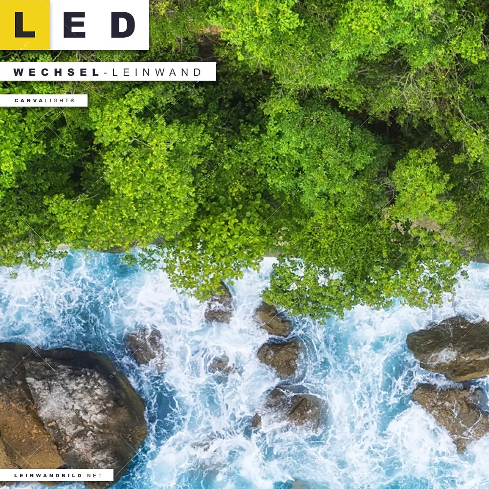 Auf der Suche nach Deinem neuen Wechselmotiv für LED Bilder mit austauschbarer Textil-Leinwand haben Dich Begriffe wie Wald, Landschaft, Baum, Bäume, Natur, Nadelwald, Laubwald, Meer, Wellen, Felsen, Vogelperspektive, Insel inspiriert? Dann sollte die Wechsel-Leinwand Waldlandschaft an der Küste für Canvalight® TEX LED Leuchtbilder den Weg zu Dir finden.