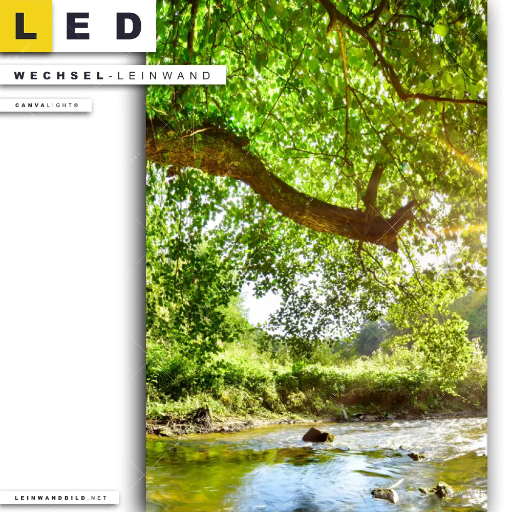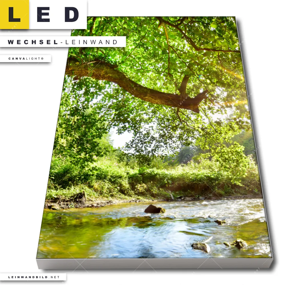 LED Wechsel-Leinwand Canvalight® TEX | Wald mit Bach bei Sonnenschein | Hochformat