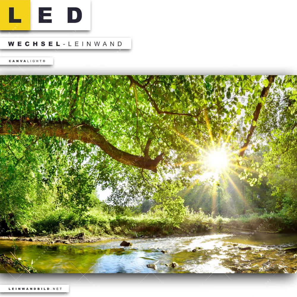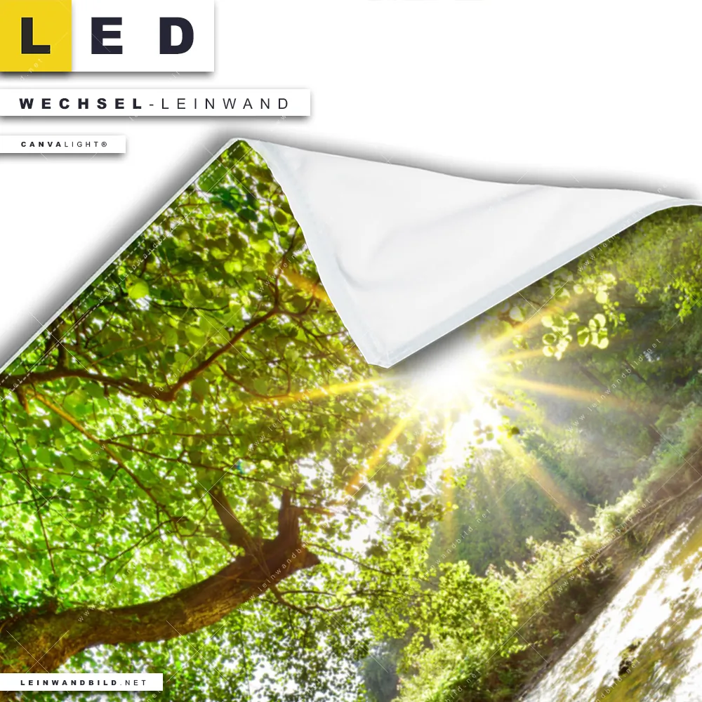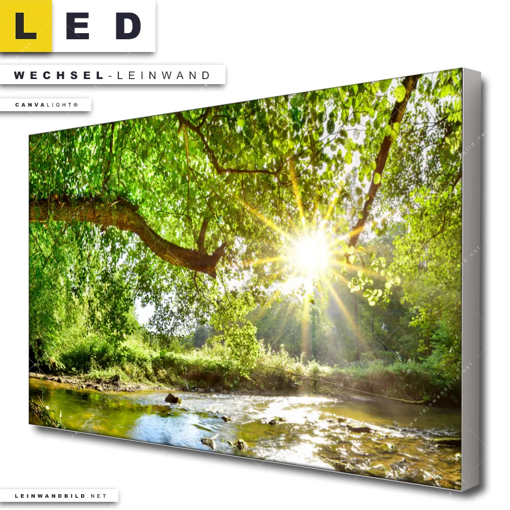LED Wechsel-Leinwand Canvalight® TEX | Wald mit Bach bei Sonnenschein | Querformat