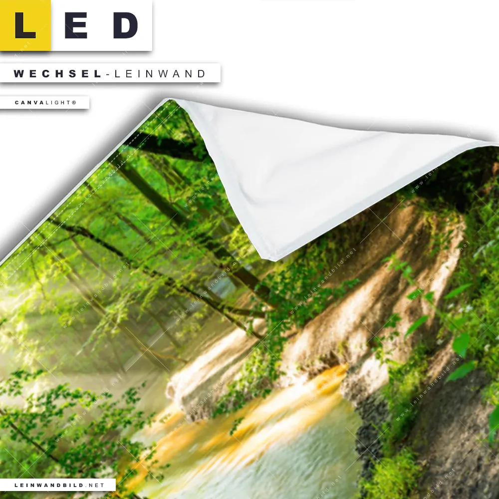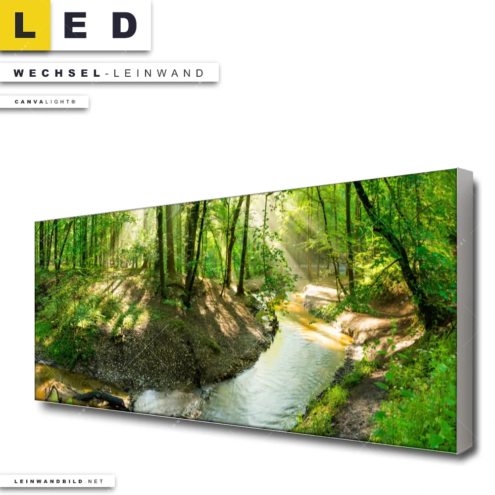 Du konfigurierst Deine individuelle LED Wechsel-Leinwand Canvalight® TEX | Wald mit Bach | Panorama und wir produzieren sie NEU für Dich. Unsere Landschaften, Wald - Bäume Austausch-Fotoleinwände für Canvalight® LED Bilder sind KEINE Lagerware. Du bist Dir unsicher, welches Motiv oder Format das richtige für dein individuelles LED Wechselmotiv auf Leinwand ist, dann helfen wir dir gerne weiter und beraten dich!