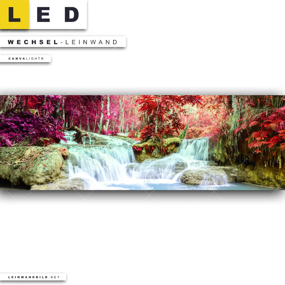 Dann sollte die Wechsel-Leinwand Canvalight® TEX | Wald & Wasserfall No. 3 | Panorama den Weg zu Dir finden. Die Austausch-Leinwand farbenfroher Wald mit Wasserfall - passend für unsere stufenlos dimmbaren, steckerfertigen Leinwandbilder im LED Leuchtrahmen mit Fernbedienung und optionaler Farbtemperatursteuerung - fügt sich als Eye-Catcher harmonisch in jedes Arzt - Praxis, Büro - Kanzlei, Wohnzimmer - Schlafzimmer Raumkonzept ein.