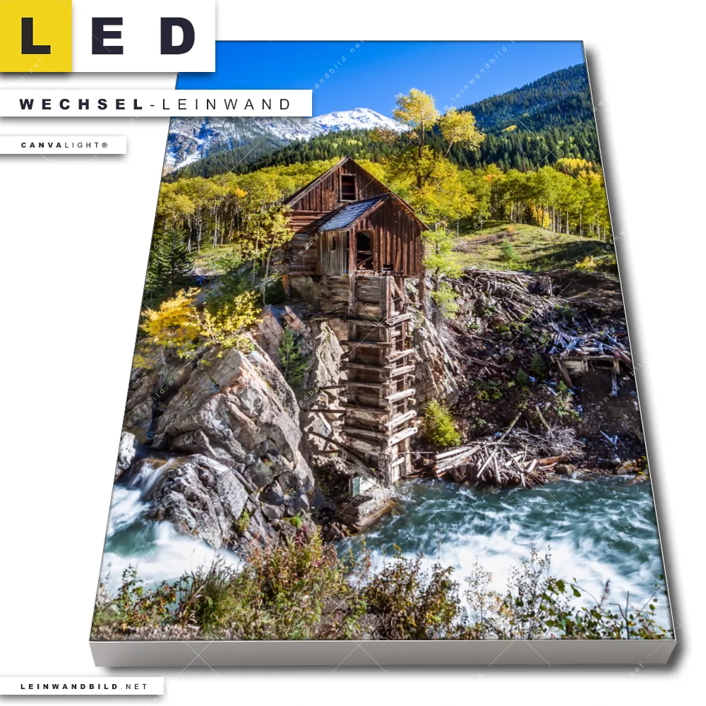 LED Wechsel-Leinwand Canvalight® TEX | Waldhütte am Fluss | Hochformat