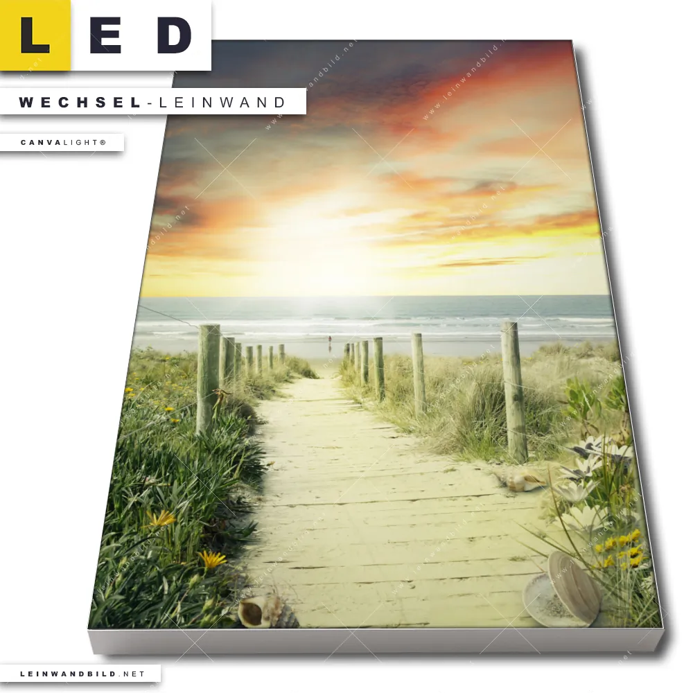 Du bist auf der Suche nach einer Landschaften, Strand - Meer Wechsel-Leinwand für Dein LED-Leinwandbild im Hochformat? Begriffe wie Steg, Weg, Muschel, Sonnenuntergang - Sonnenaufgang, Ostsee - Nordsee, Urlaub - Reisen, Pier, Deutschland, Sommer, Frühling haben Dich auf der Suche nach Deiner Ersatz-Leinwand für dein LED Wandbild mit wechselbarer Leinwand inspiriert? Farben wie Grün, Beige dürfen auf Deinem neuen Wechselmotiv für Dein XXL Leinwand-LED-Bild nicht fehlen und Leinwände im Natürlich - Realistisch Stil für Leuchtbilder passen perfekt zu Deinem Einrichtungsstil?