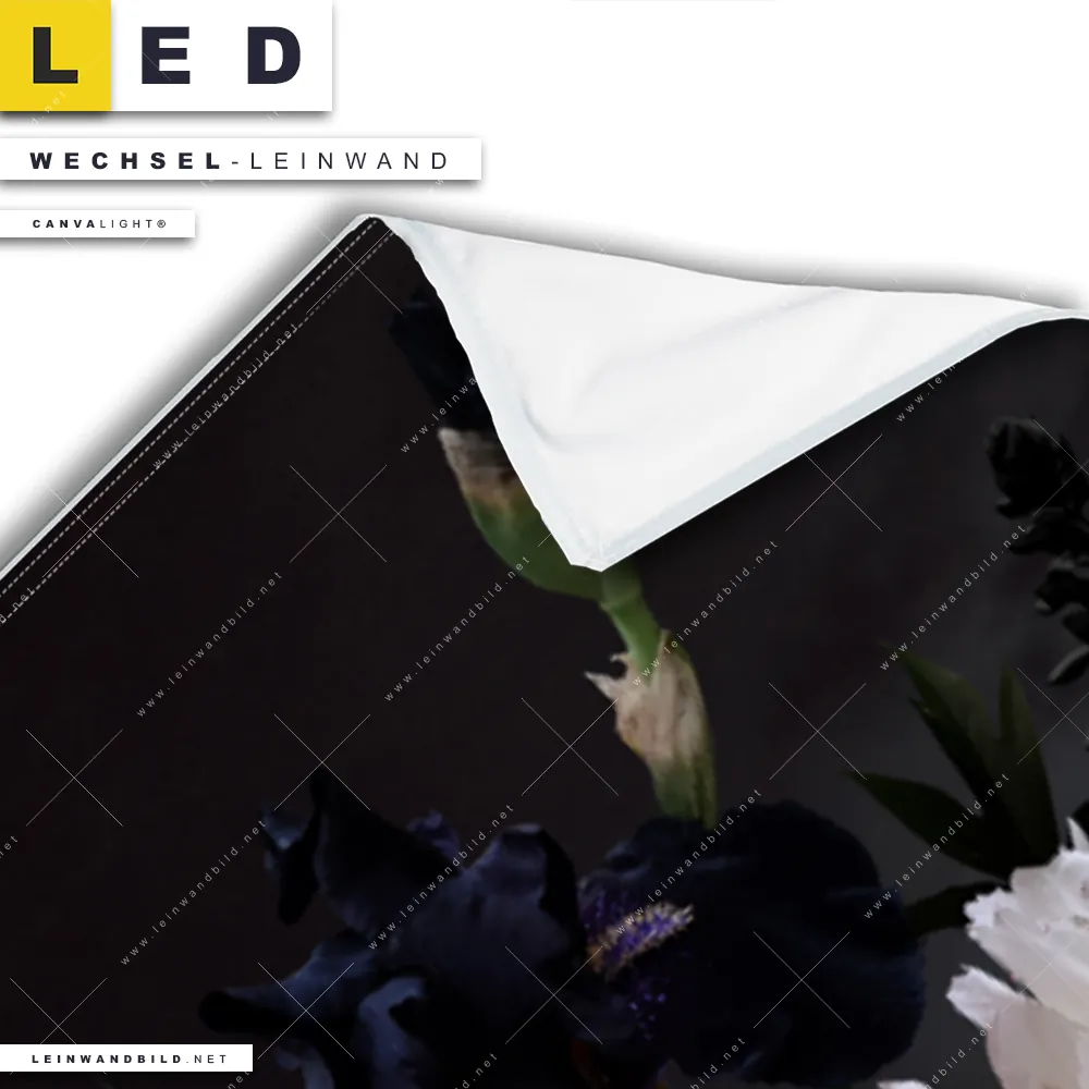 Bitte beachte, dass die Farben, der auf dem Monitor abgebildeten Blütenpracht vor dunklem Hintergrund Darstellung, möglicherweise von den Originalfarben deiner Canvalight® TEX Wechsel-Leinwand abweichen können.
