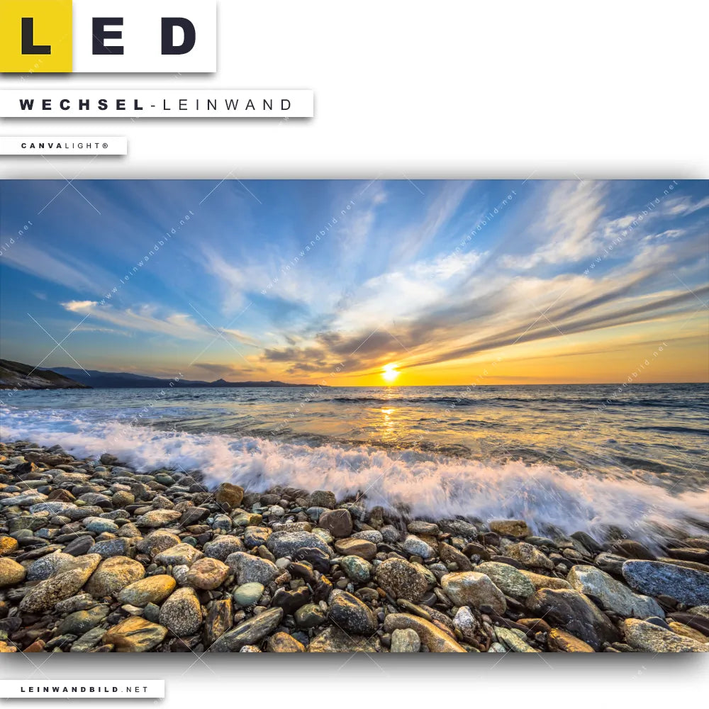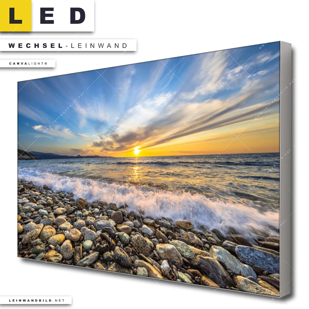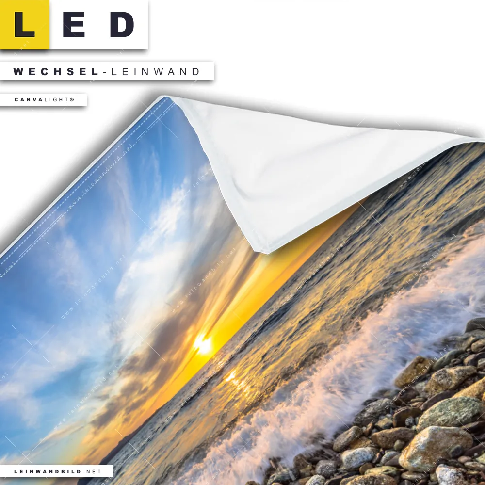 Du bist auf der Suche nach einer Strand - Meer, Landschaften Wechsel-Leinwand für Dein LED-Leinwandbild im Querformat? Begriffe wie Küste, Felsen, Sommer, Ostsee - Nordsee, Sonnenuntergang - Sonnenaufgang, Deutschland, Steine, Frühling, Wellen -Surfen haben Dich auf der Suche nach Deiner Ersatz-Leinwand für dein breites LED Wandbild mit wechselbarer Leinwand inspiriert? Farben wie Blau, Hellblau, Orange, Beige dürfen auf Deinem neuen Wechselmotiv für Dein XXL Leinwand-LED-Bild nicht fehlen und Leinwände im Natürlich - Realistisch Stil für Leuchtbilder passen perfekt zu Deinem Einrichtungsstil?