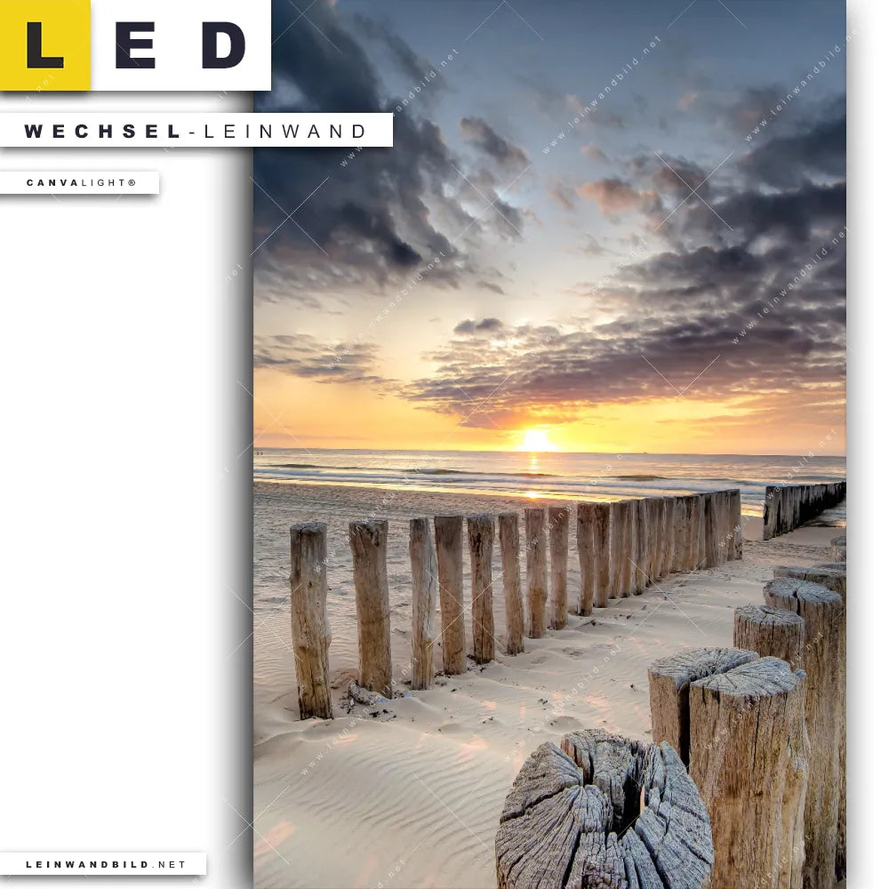 LED Wechsel-Leinwand Canvalight® TEX | Wellenbrecher am Nordseestrand | Hochformat