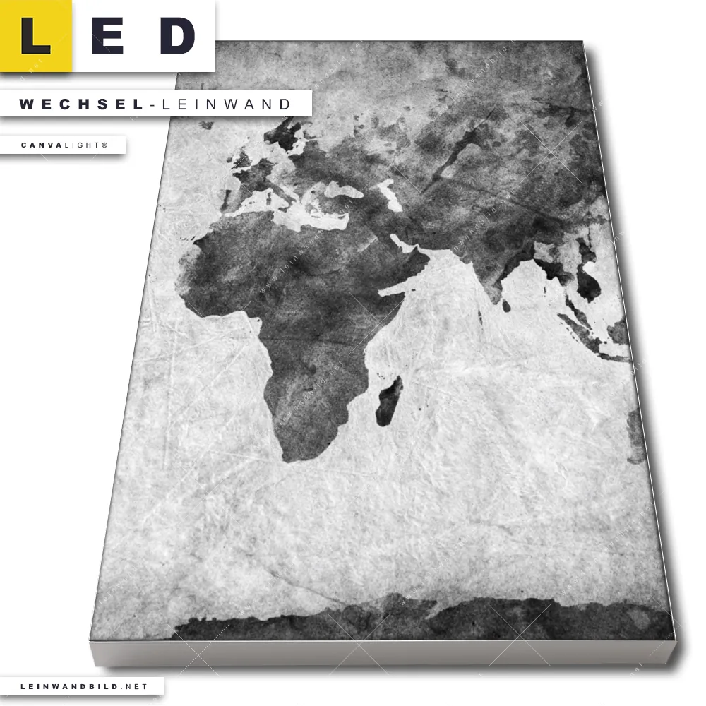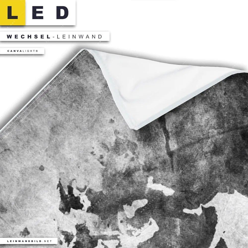 LED Wechsel-Leinwand Canvalight® TEX | Weltkarte Grautöne | Hochformat