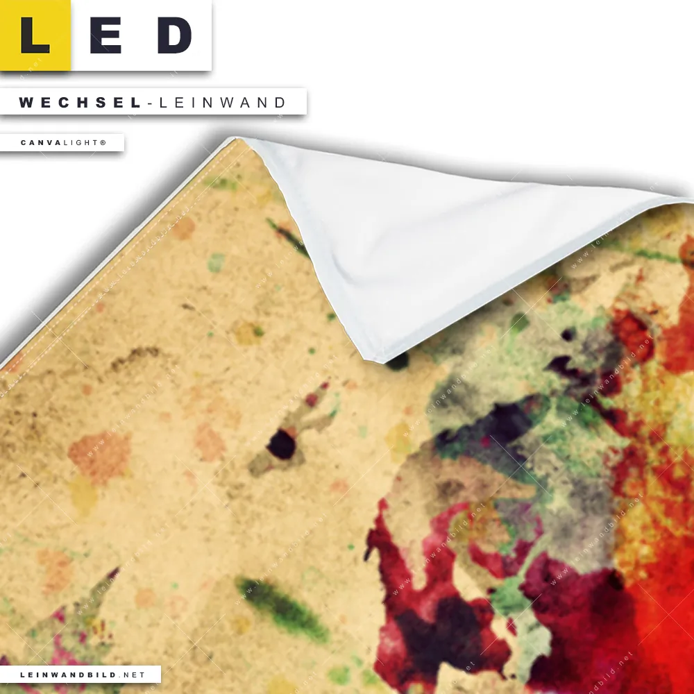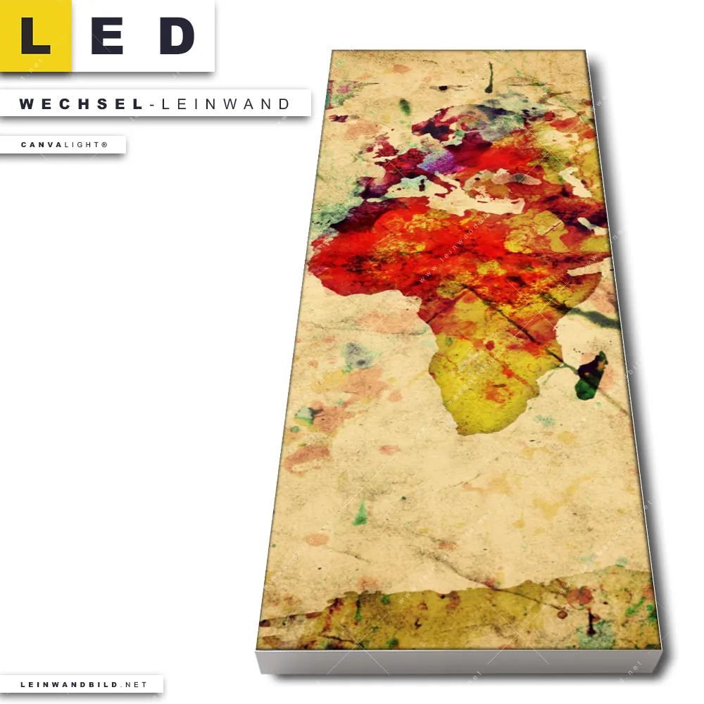 LED Wechsel-Leinwand Canvalight® TEX | Weltkarte Retro Bunt | Schmal
