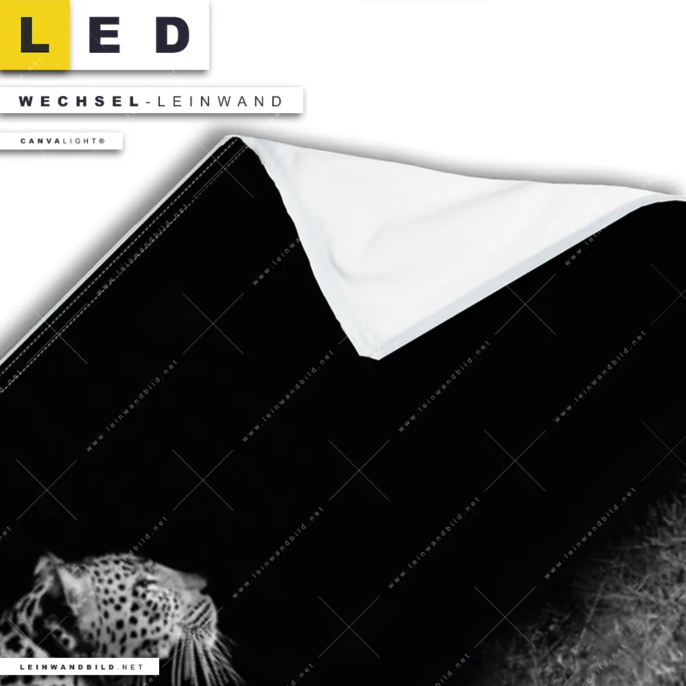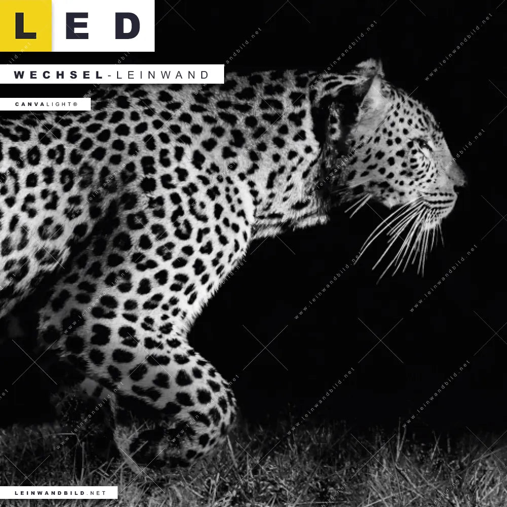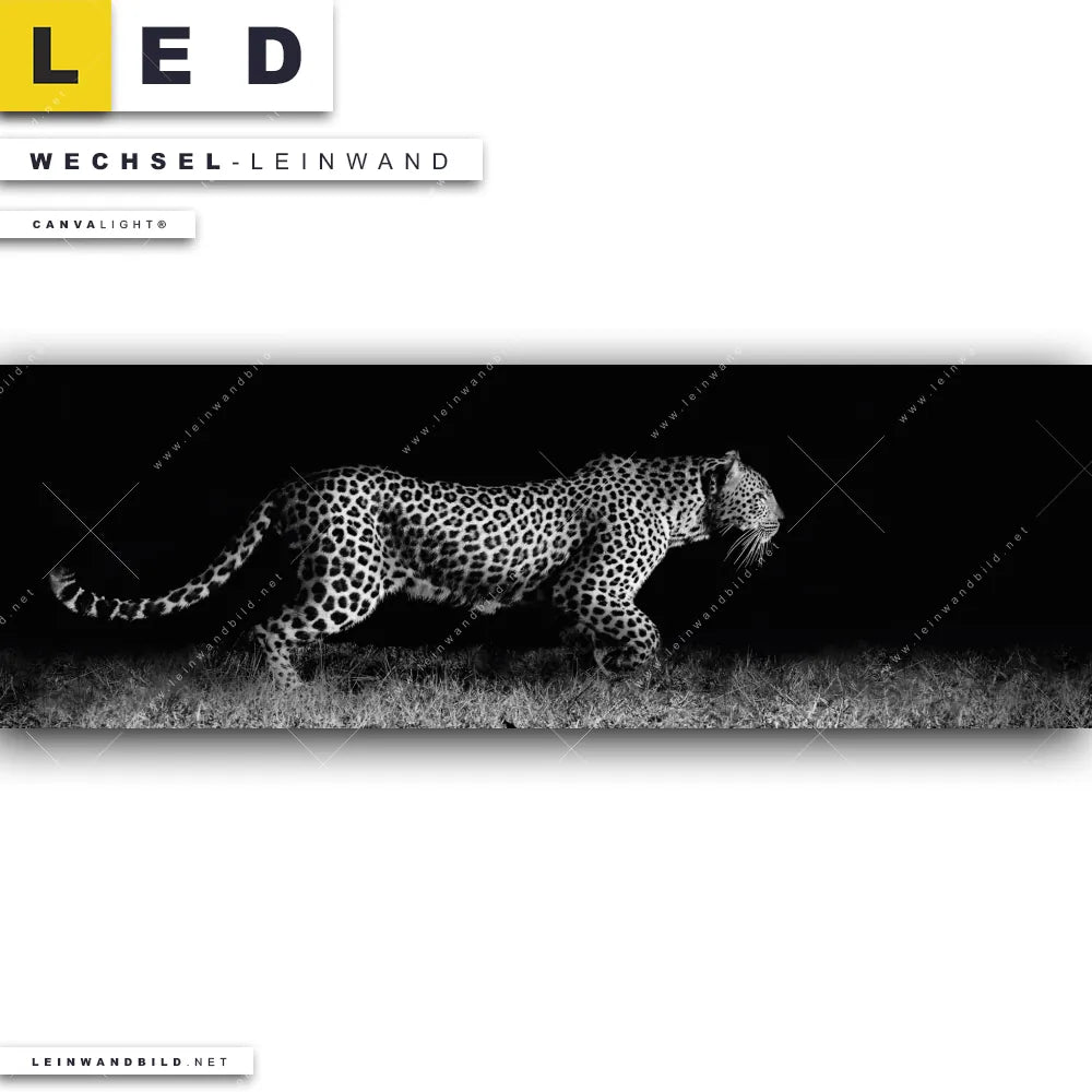 Du bist auf der Suche nach einer Tierwelt Wechsel-Leinwand für Dein LED-Leinwandbild im Panorama-Format? Begriffe wie Raubkatze, Leopard, Afrika, Dschungel, wild, Safari, frei, Nacht, dunkel haben Dich auf der Suche nach Deiner Ersatz-Leinwand für dein extra breites LED Wandbild mit wechselbarer Leinwand inspiriert? Farben wie Weiss, Schwarz dürfen auf Deinem neuen Wechselmotiv für Dein XXL Leinwand-LED-Bild nicht fehlen und Leinwände im Schwarz - Weiss Stil für Leuchtbilder passen perfekt zu Deinem Einrichtungsstil?